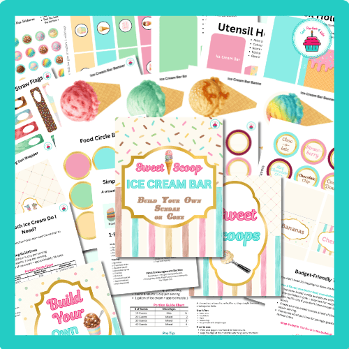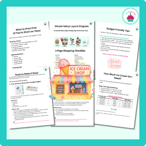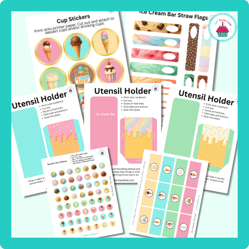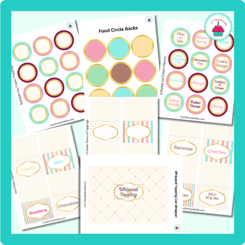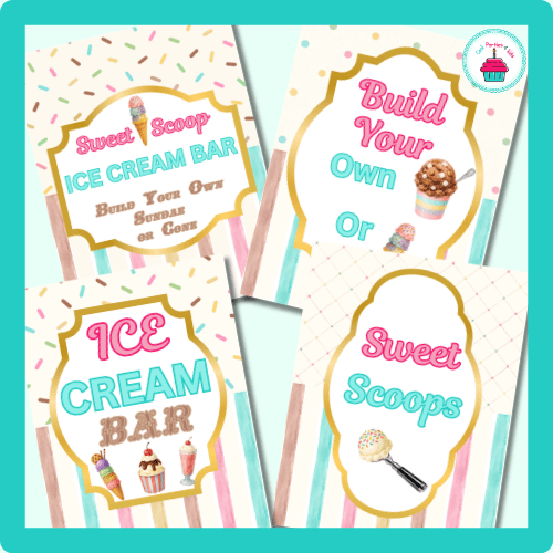 This printable party set makes it easy to create a charming DIY sundae station where guests can build their own delicious ice cream treats.