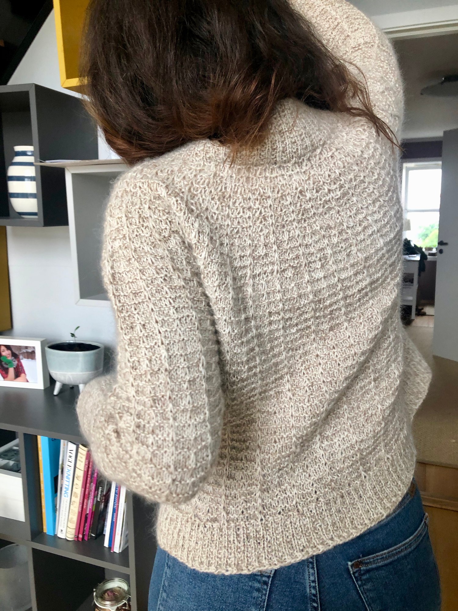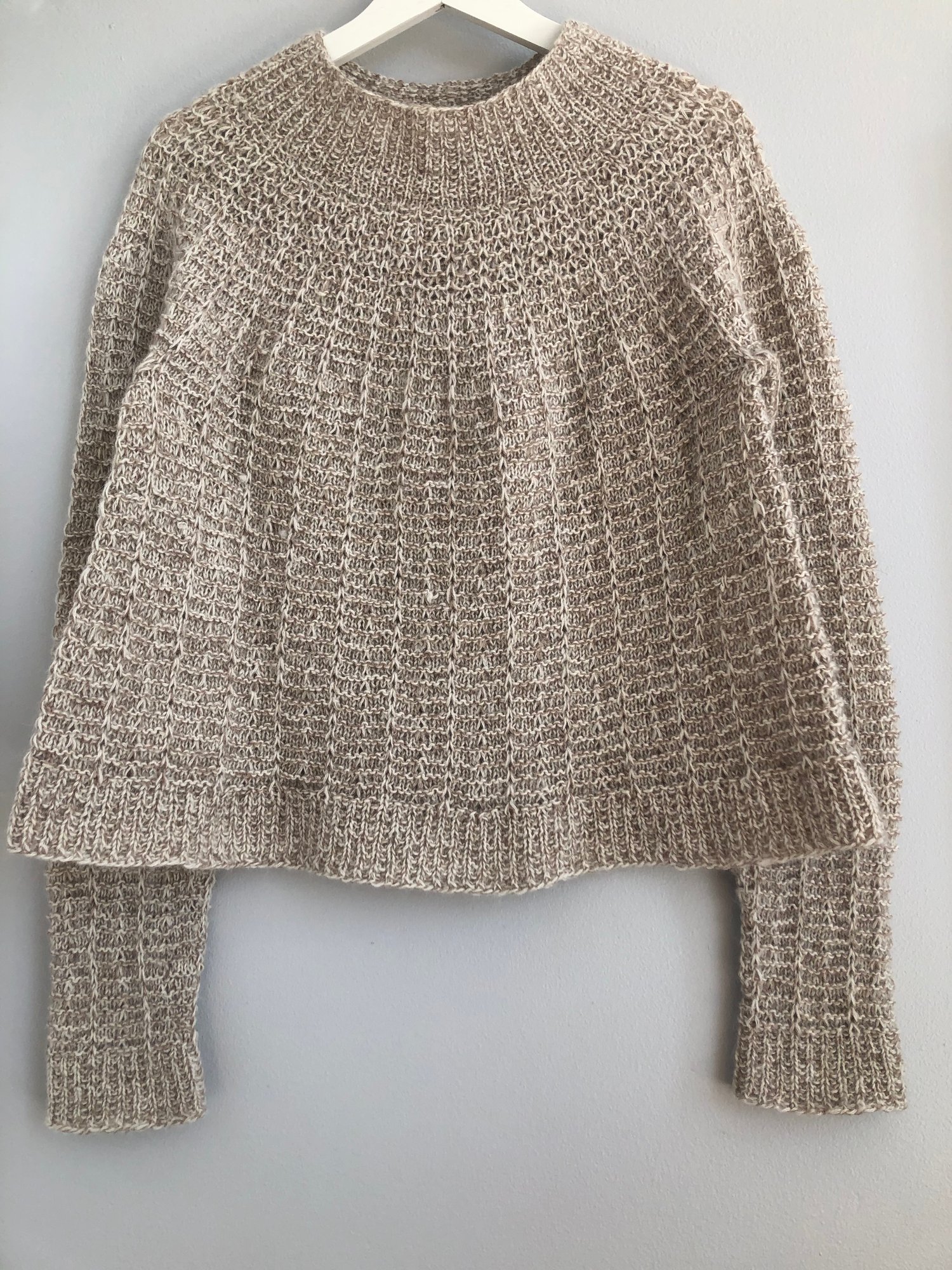 The Matrix Jumper is worked in the round from the top to down. The back neck is risen up with using groups of Short rows integrated into stitch pattern. Once Yoke part is complete , stitches are provisional cast on at the underarm and the Body and Sleeves are divided. Increases in the Body section creates a nice feminine shape and slightly A-silhouette. It’s two variants for sleeves: first a extra long, slim fit, with decreases along and another one - where sleeve are worked straight, with any decreasing. Both variants expect working on sleeves from underarm to the cuffs direction in the round with Mock Rib on the cuffs.