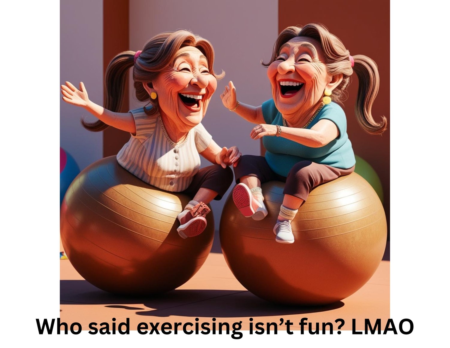 Who Said Exercising Isn't Fun? LMAO Two friends having fun with exercise balls and laughing out loud. This PDF file can be printed and will fit an 8 inch by 10 inch frame or a 5 by 7 frame.
