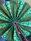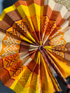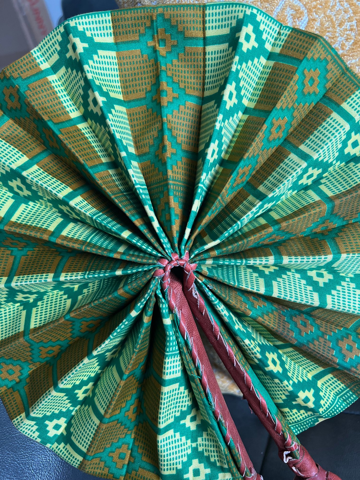 This is a random listing of one fan. If you purchase, we'll select one that may or may not be in the pictures above. This hand-held fan made from colorful Ankara or African fabric with genuine leather handle.