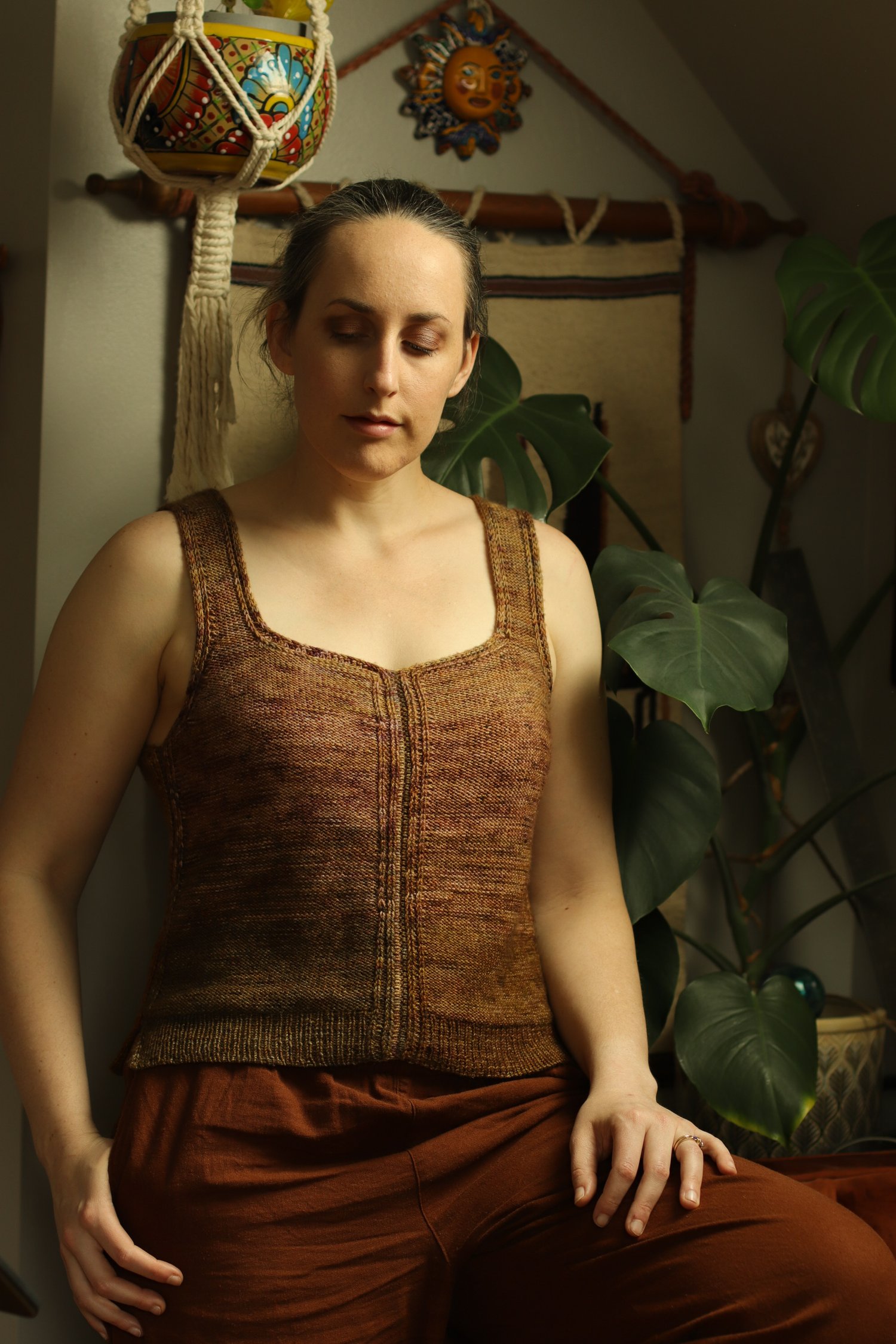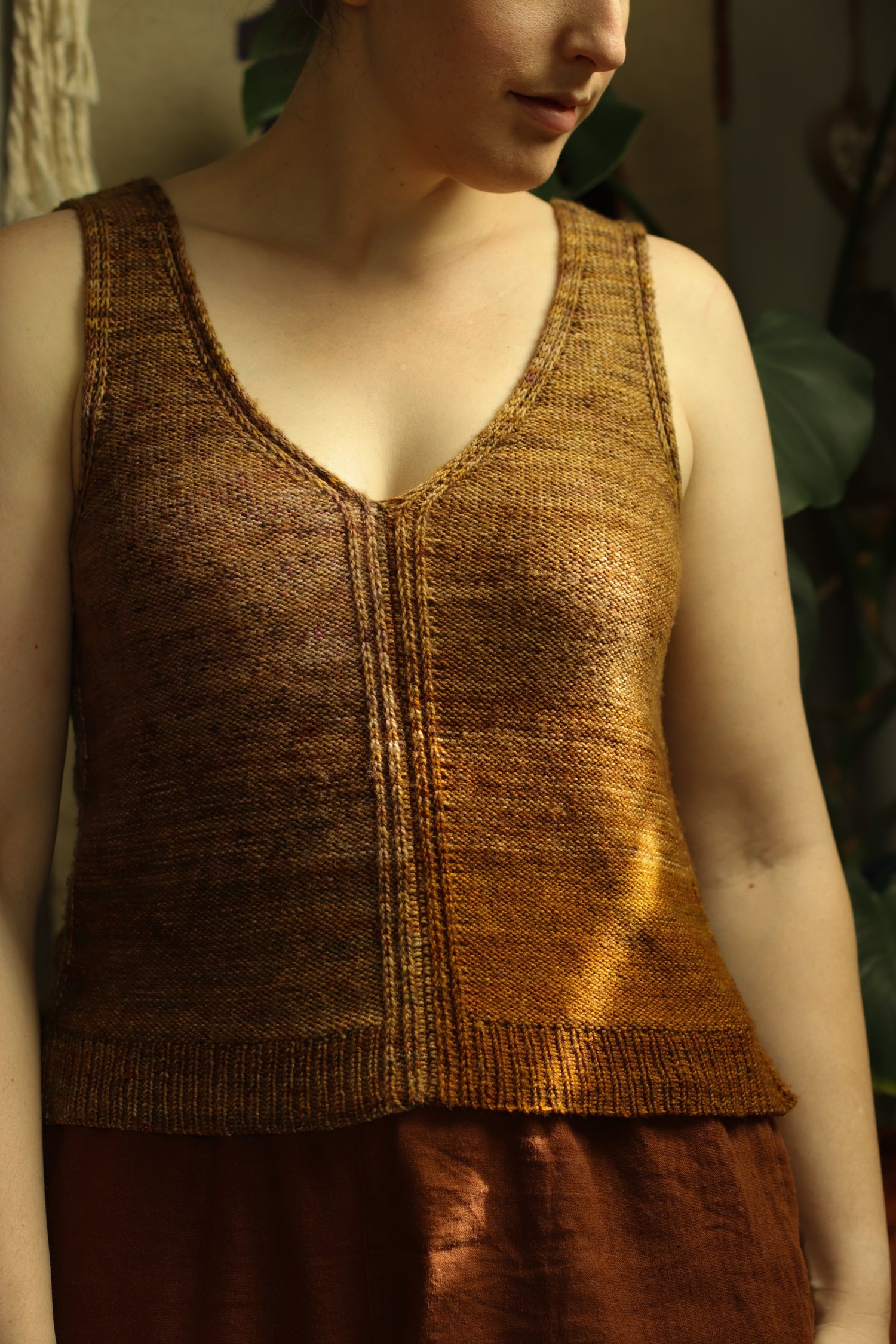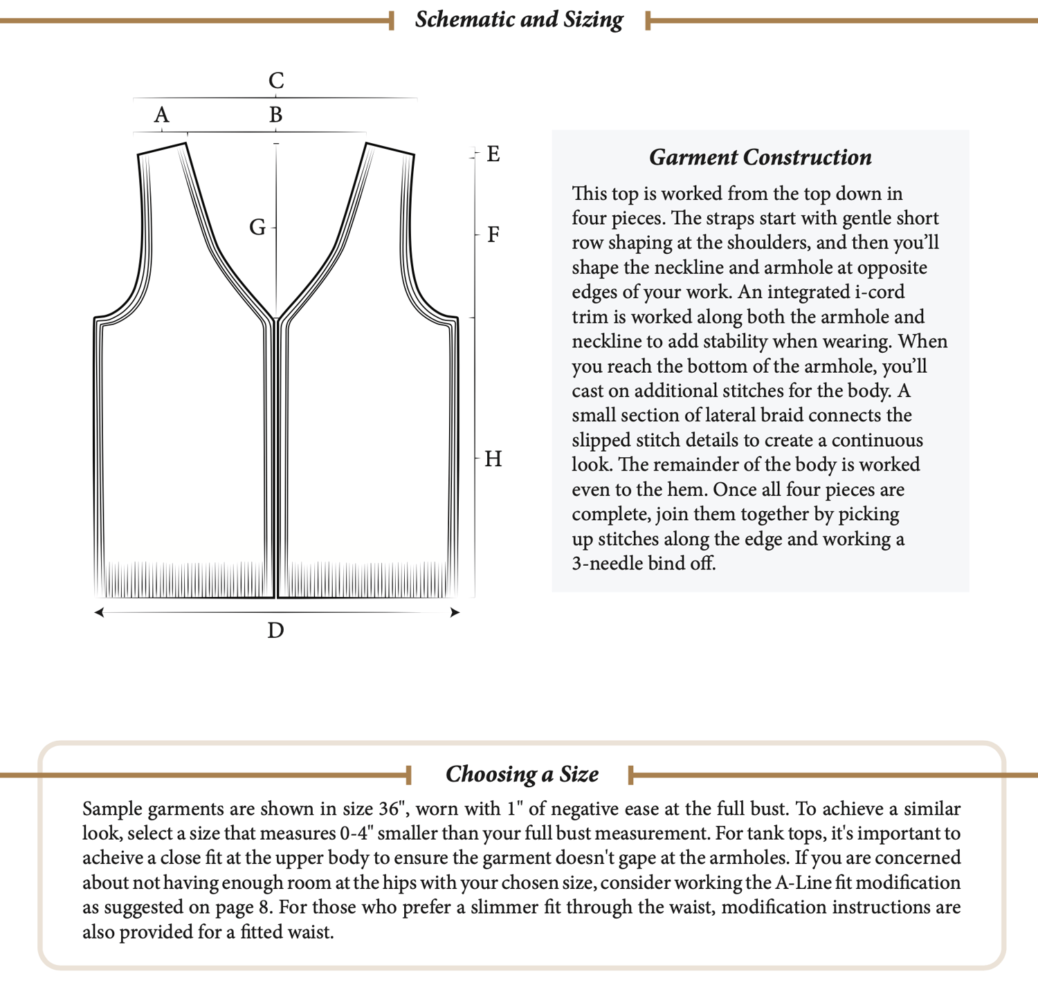 Garment Construction: This top is worked from the top down in four pieces. The straps start with gentle short row shaping at the shoulders, and then you’ll shape the neckline and armhole at opposite edges of your work. An integrated i-cord trim is worked along both the armhole and neckline to add stability when wearing. When you reach the bottom of the armhole, you’ll cast on additional stitches for the body. A small section of lateral braid connects the slipped stitch details to create a continuous look. The remainder of the body is worked even to the hem. Once all four pieces are complete, join them together by picking up stitches along the edge and working a 3-needle bind off.