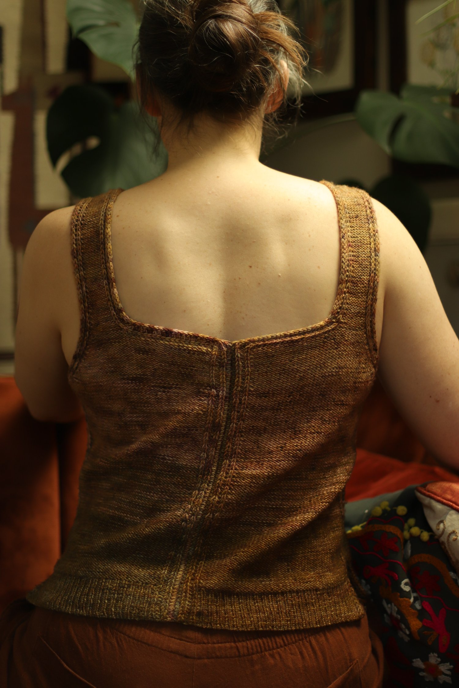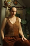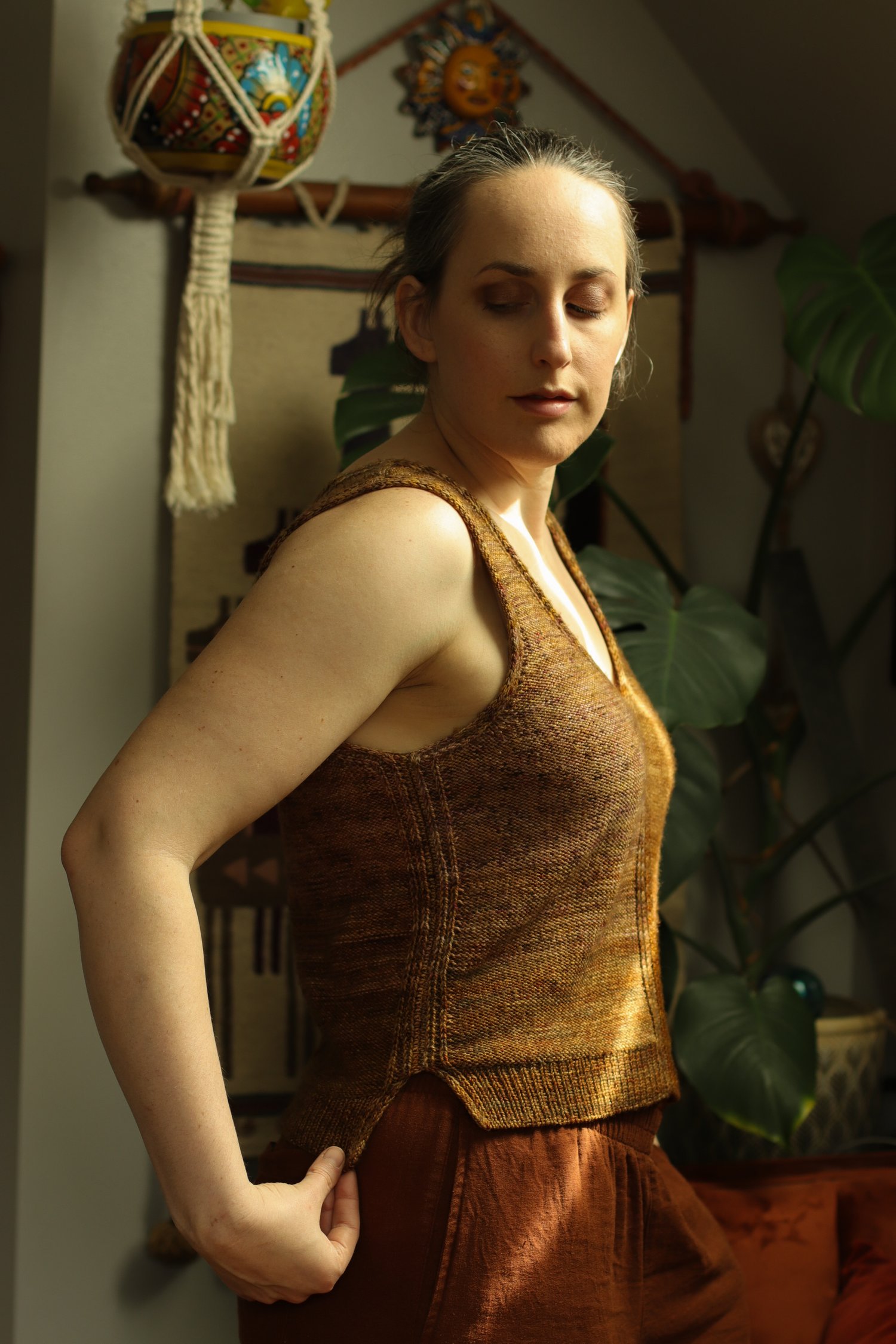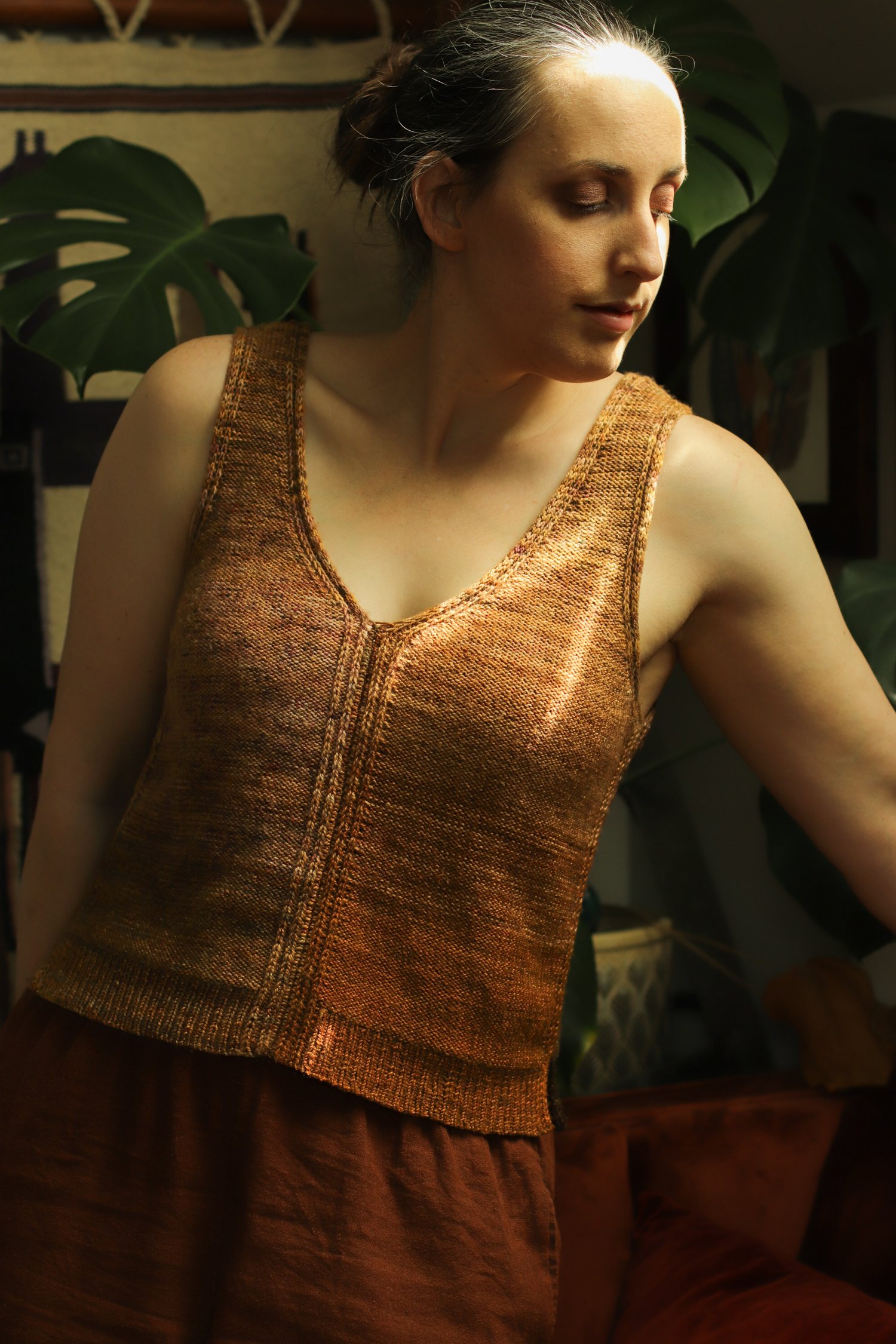 Garment Construction: This top is worked from the top down in four pieces. The straps start with gentle short row shaping at the shoulders, and then you’ll shape the neckline and armhole at opposite edges of your work. An integrated i-cord trim is worked along both the armhole and neckline to add stability when wearing. When you reach the bottom of the armhole, you’ll cast on additional stitches for the body. A small section of lateral braid connects the slipped stitch details to create a continuous look. The remainder of the body is worked even to the hem. Once all four pieces are complete, join them together by picking up stitches along the edge and working a 3-needle bind off.