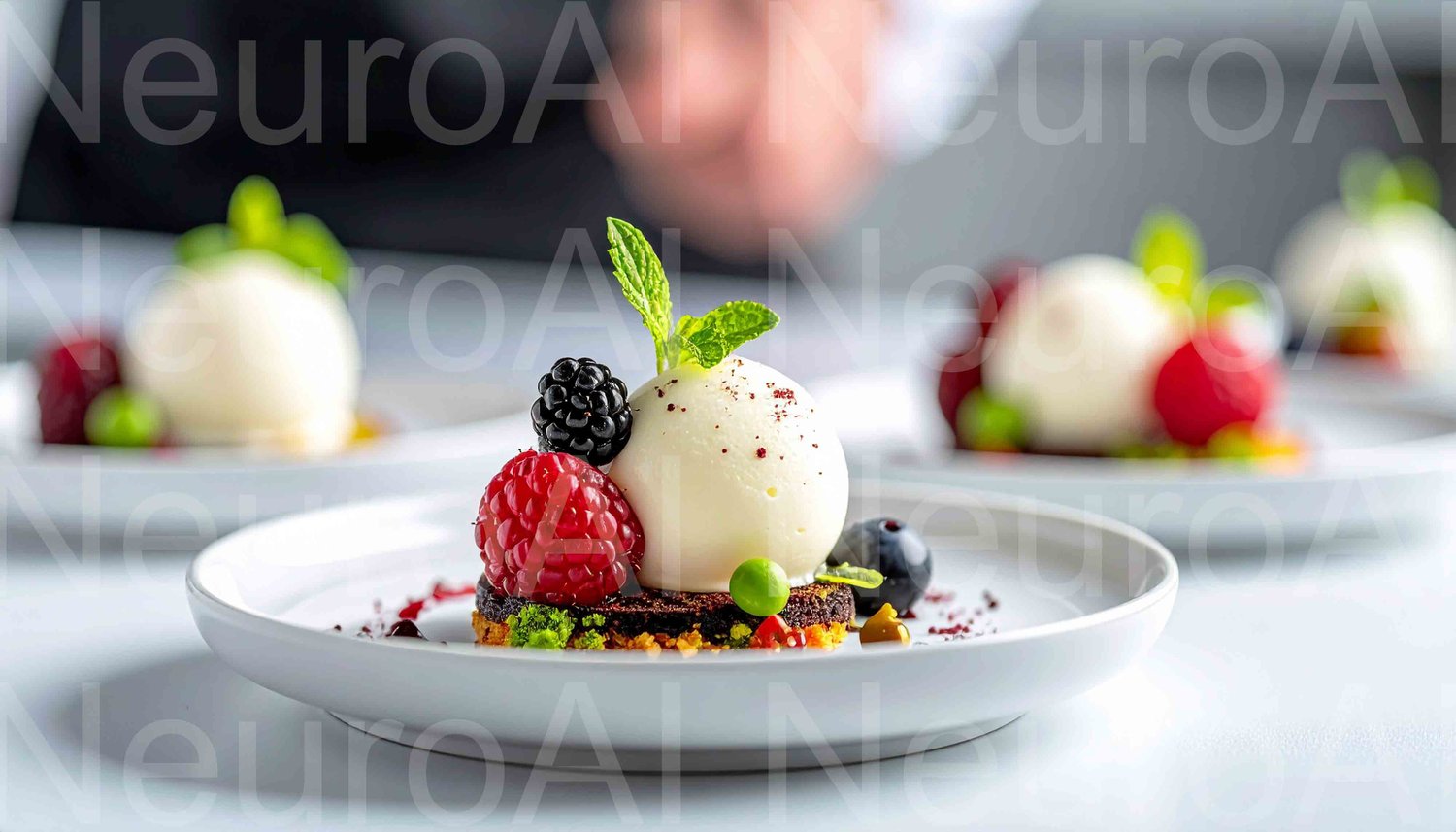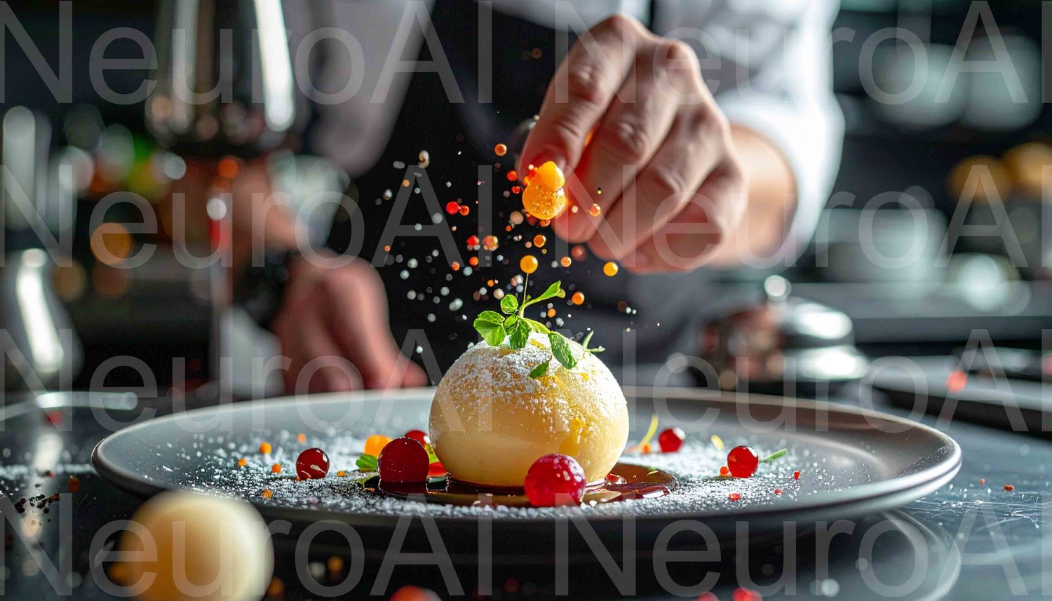 Chef meticulously garnishes exquisite dessert, creating culinary art