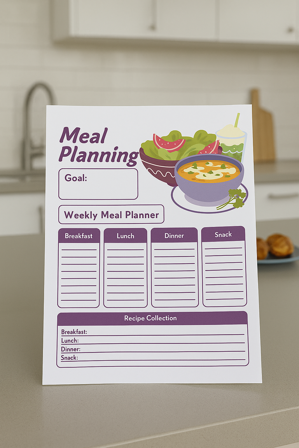 - Weekly Meal Planning section for Breakfast, Lunch, Dinner & Snacks