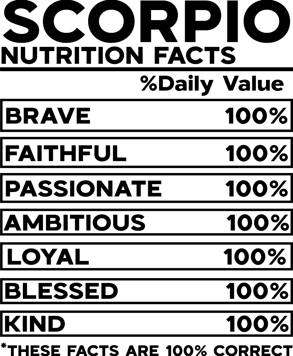 Show off the powerful, mysterious energy of a Scorpio with this bold “Scorpio Nutrition Facts” design. Intense and magnetic — just like the sign itself.