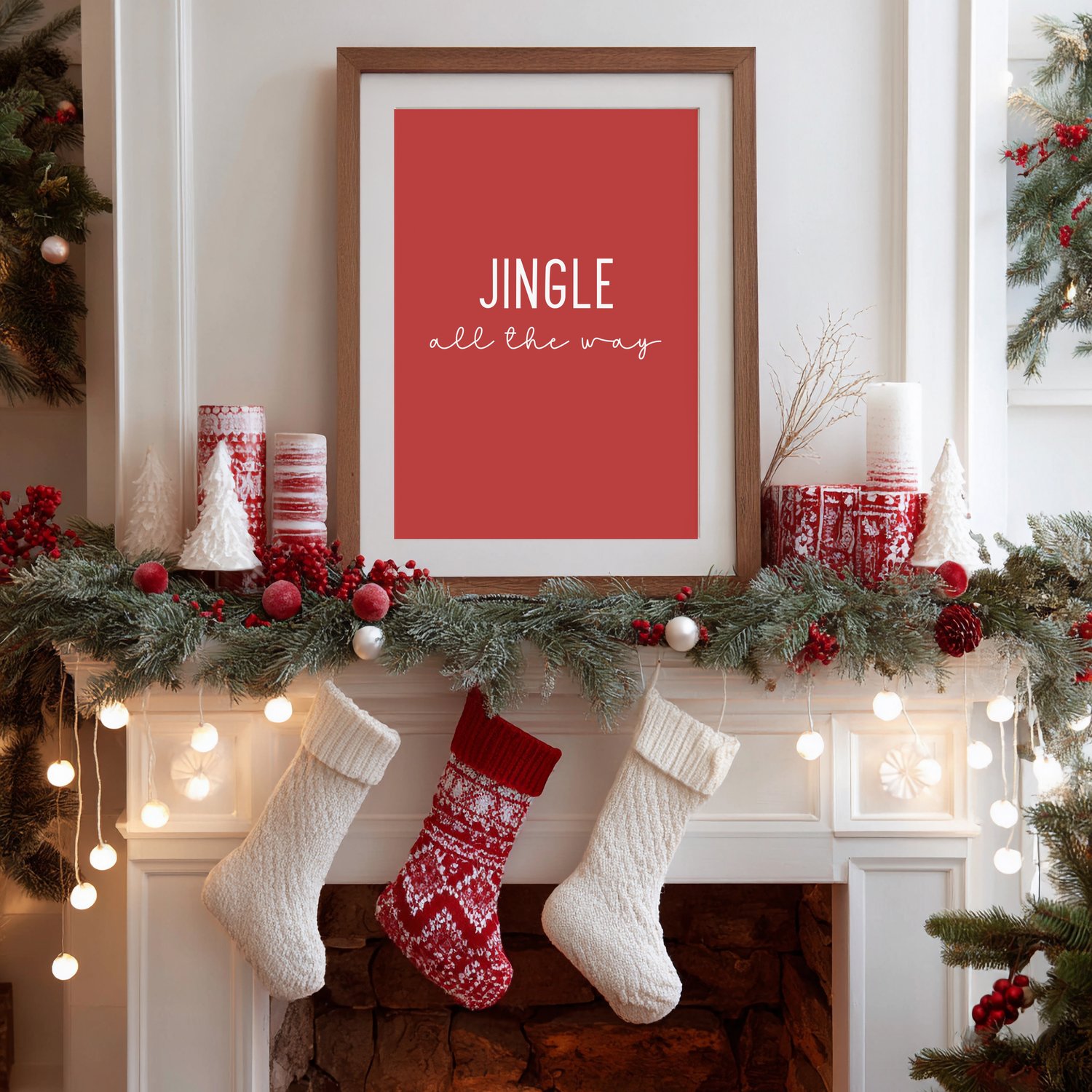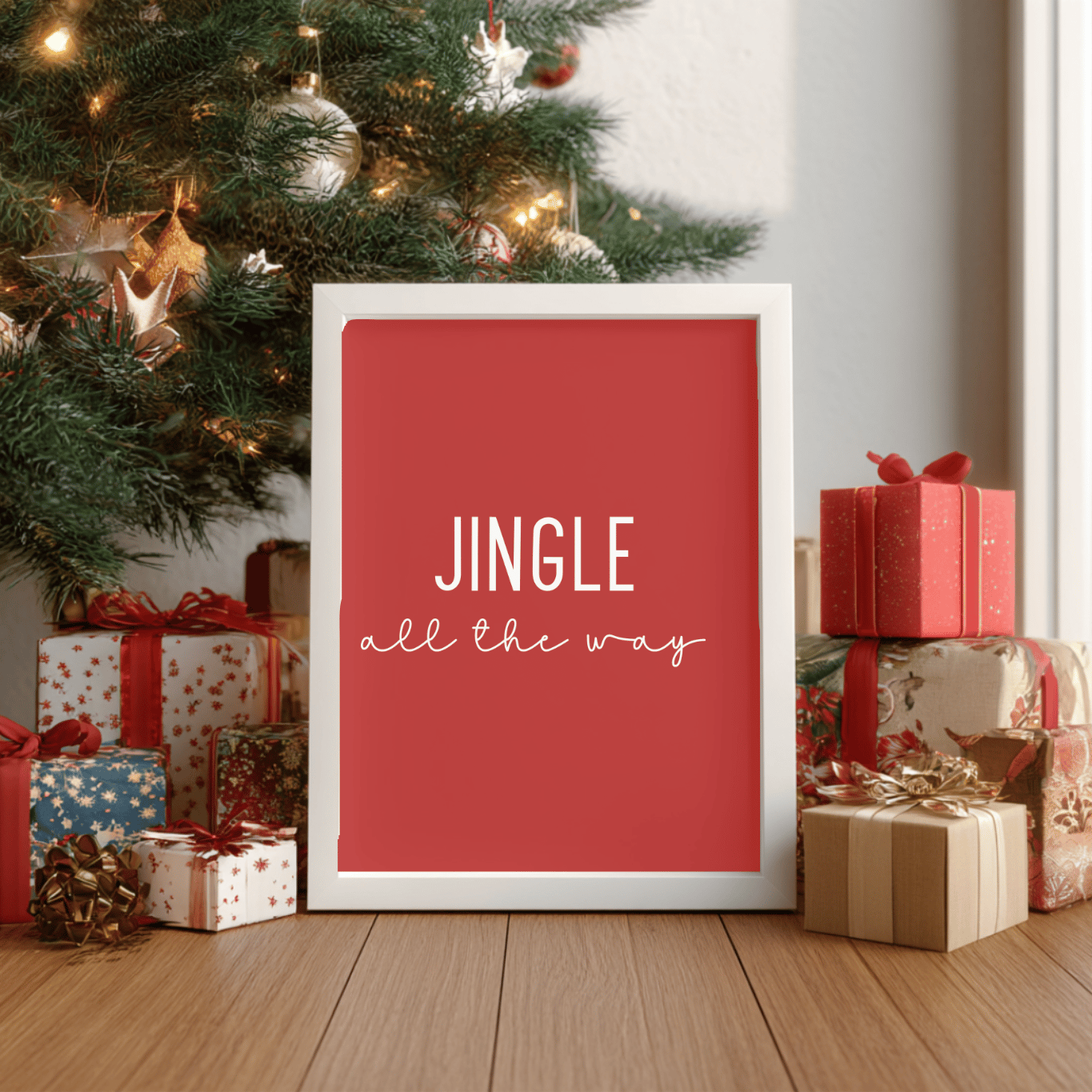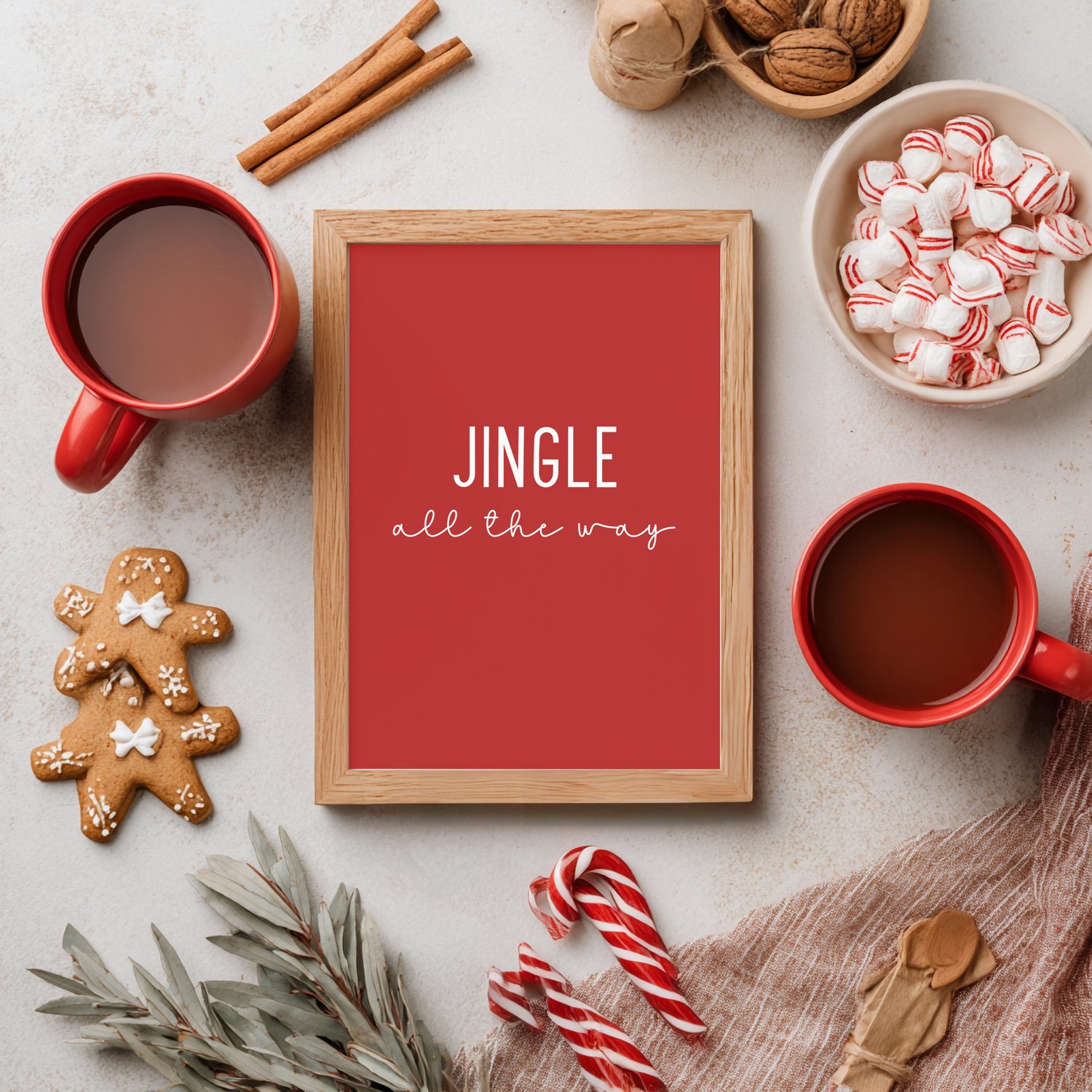 Bring festive charm into your home with this “Jingle All the Way” Christmas printable wall art! Featuring a bold red background and modern minimalist typography, this design captures the cheerful spirit of the holidays. Perfect for displaying in your kitchen, living room, or hot cocoa bar surrounded by candy canes and gingerbread treats.