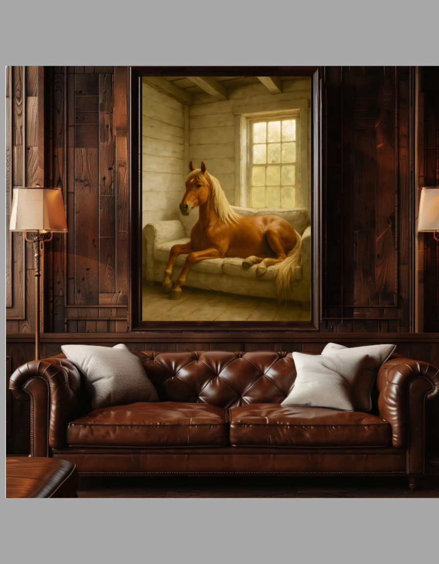 Elevate your home decor with this whimsical horse on sofa wall art digital download! This funny horse art features a majestic brown horse lounging comfortably on a plush beige sofa in a rustic wooden room, bathed in soft window light for a surreal and humorous touch. Perfect as equestrian decor or animal wall decor, this high-resolution PNG file at 300 DPI ensures crisp, professional-quality prints up to poster size.