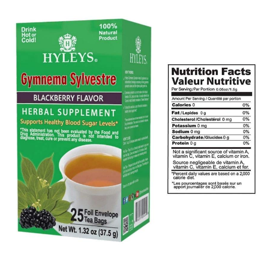 Hyleys Natural Wellness Gymnema Silvestre Green Tea With Blackberry Flavor - 25 Tea Bags (100% Natural, Sugar Free, Gluten Free and Non-GMO)