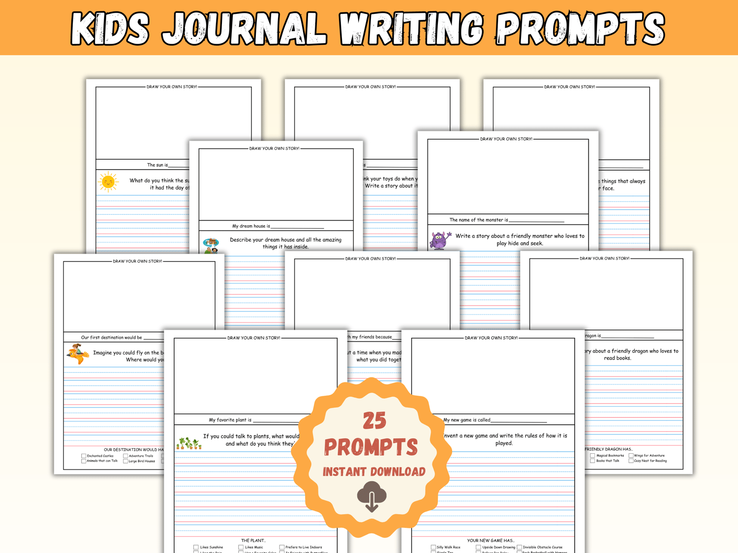 Unlock your child's imagination with our Kids Writing Prompts Planner Pages! Perfect for kids aged 6-12, this journal is designed to inspire creativity, improve writing skills, and provide hours of fun. Each page is filled with engaging prompts that encourage kids to explore their thoughts, dreams, and adventures.