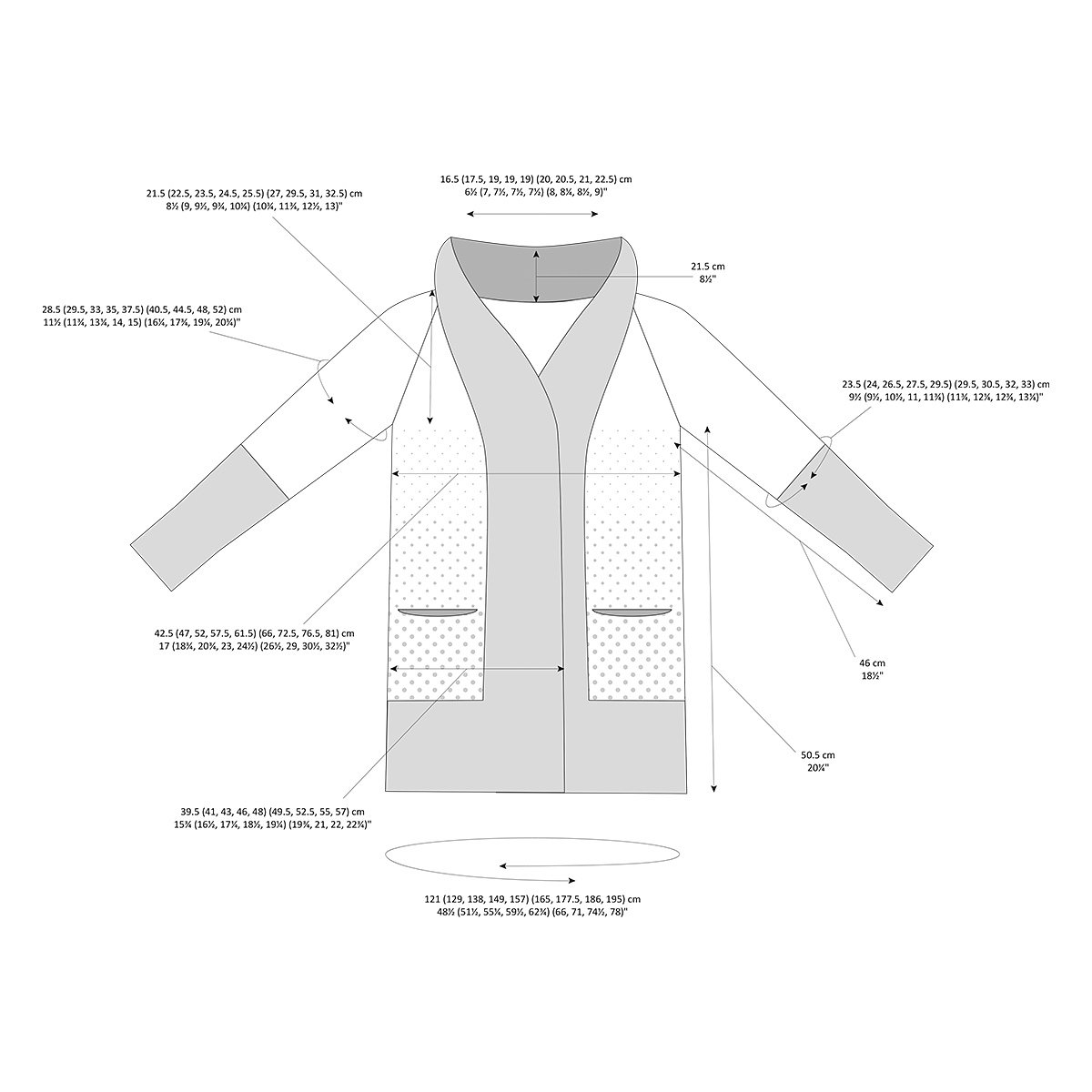 Chest circumference: 121 (129, 138, 149, 157) (165, 177.5, 186, 195) cm/48½ (51½, 55½, 59½, 62¾) (66, 71, 74½, 78)“.