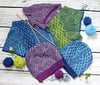 The Flowing River Hat/Cowl are the easiest knits in the set and you will learn 2 new cable stitches. The Tranquil Waters Hat/Cowl teaches 2 more cables stitches. For the third cowl, Confluence Cowl, you will layer the motifs from the first two cowls on top of teach other to create a reversible cabled design. There is a lot of cabling in these patterns; some experience with cables is helpful but not required. Fission Knitting Tutorials of the cable stitches are provided.