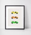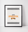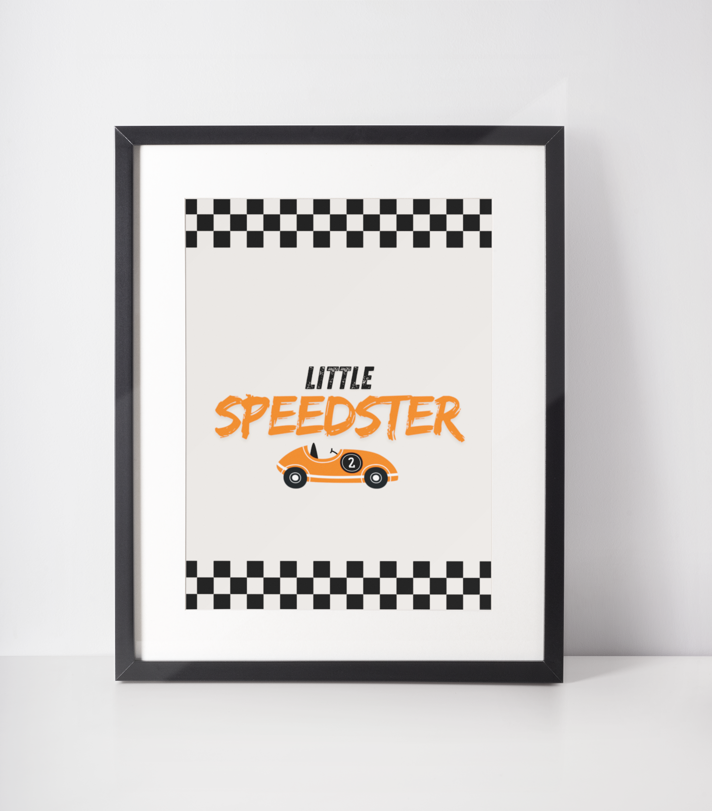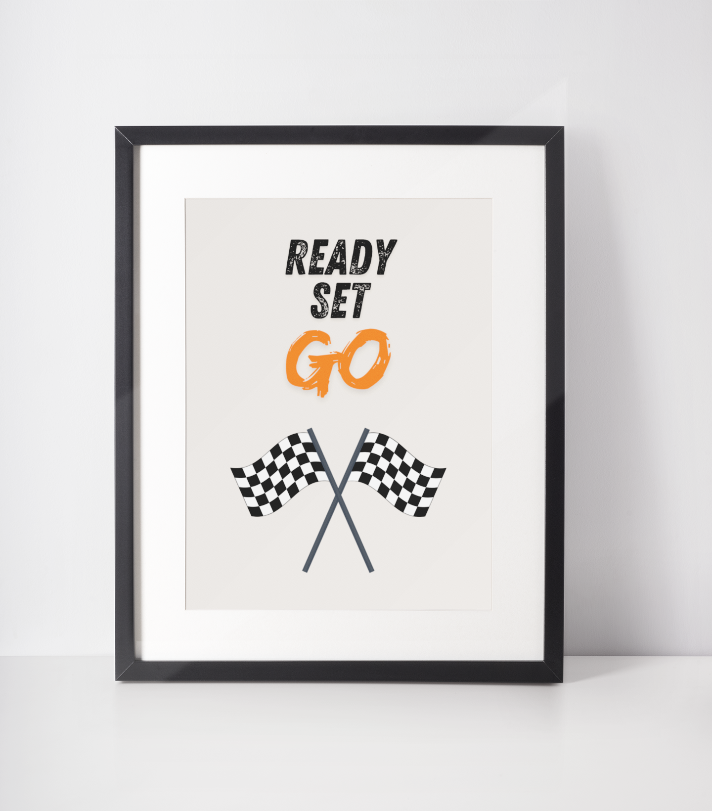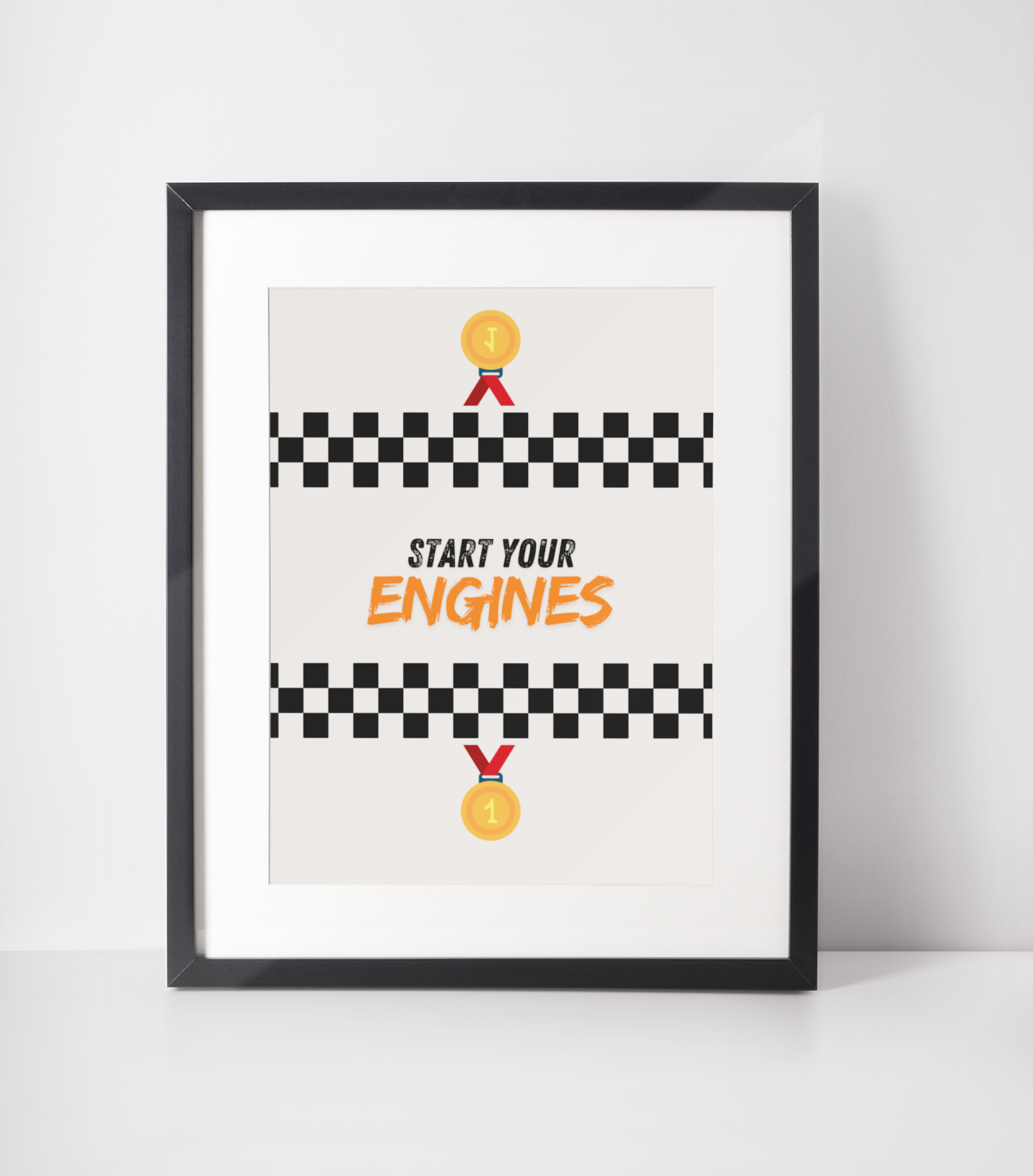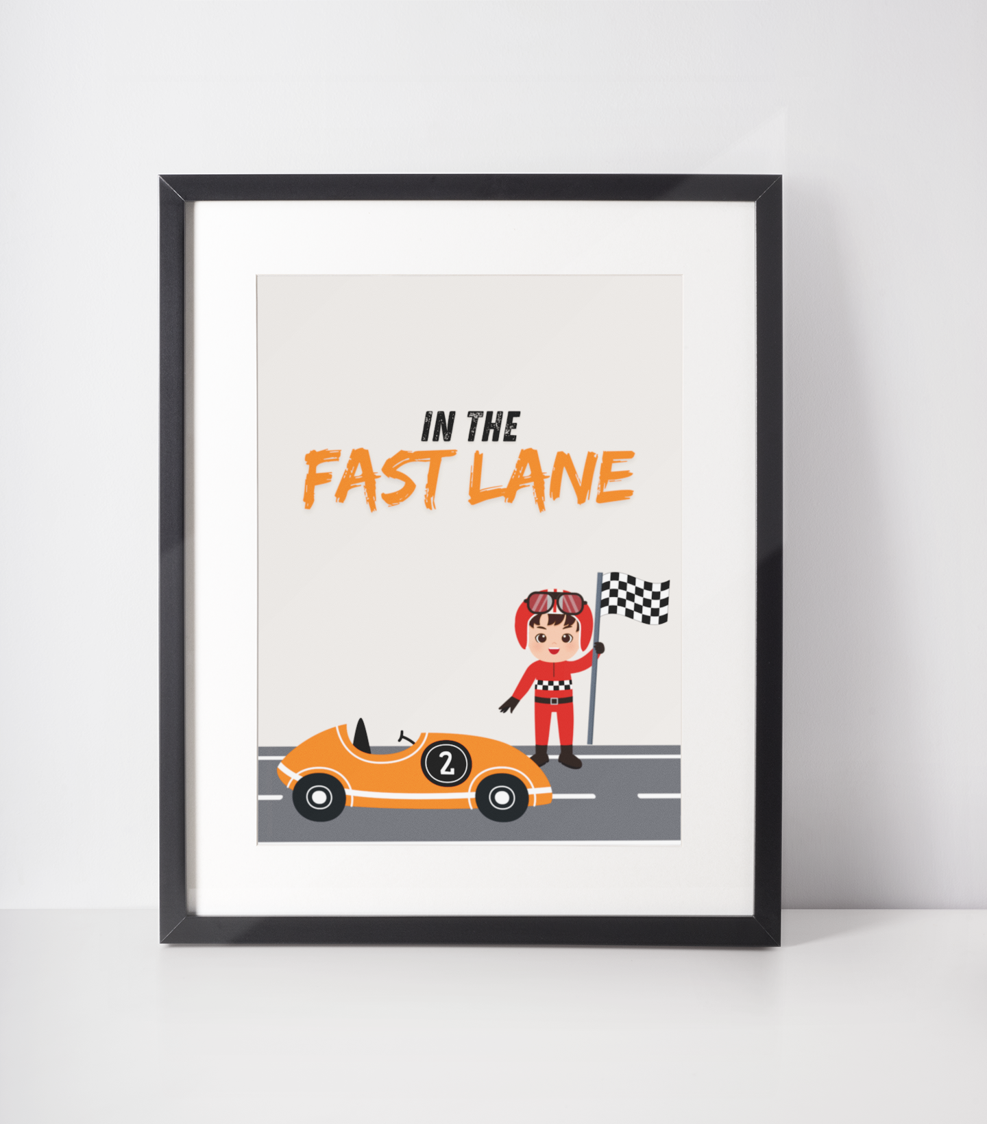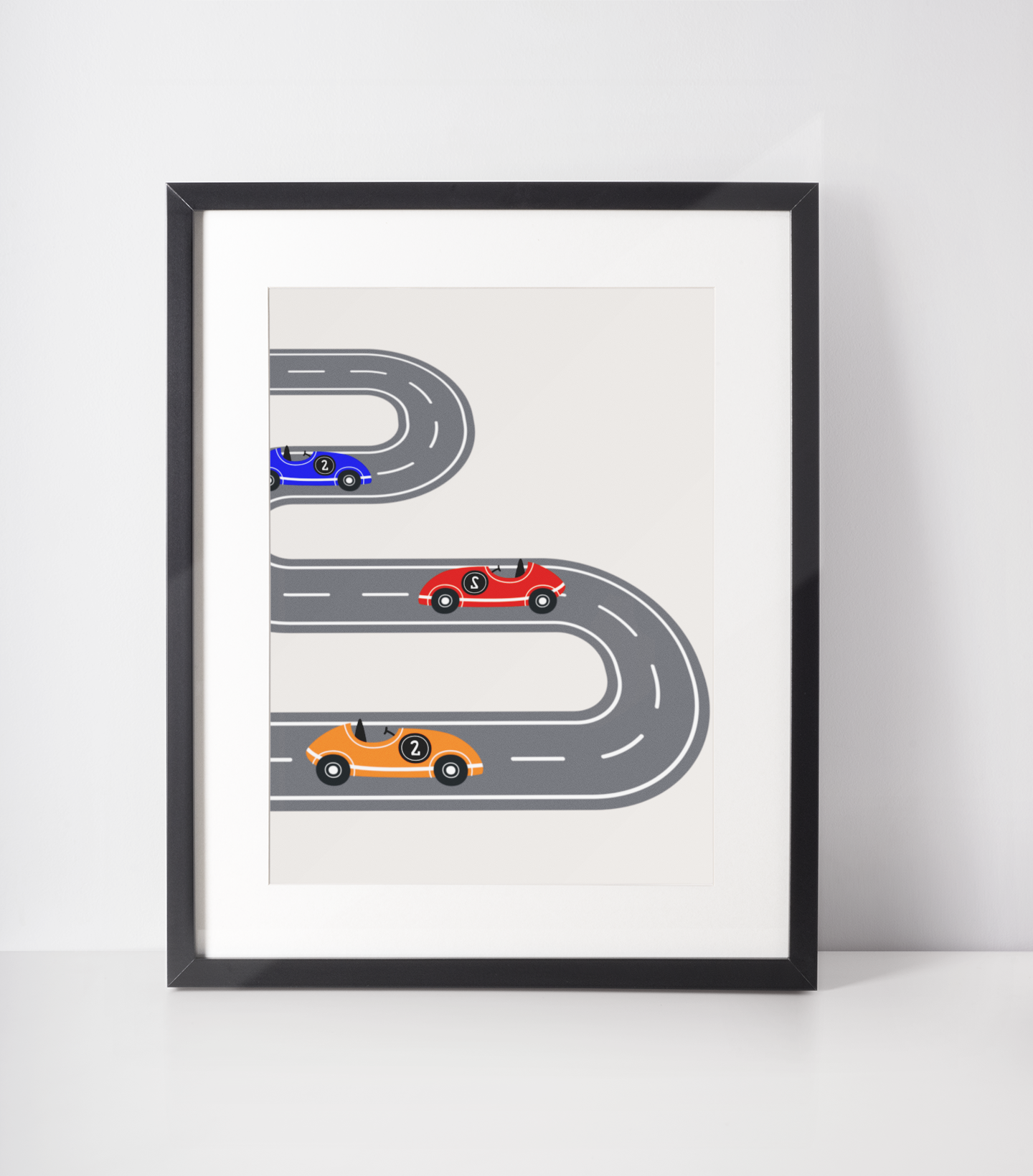 Vroom! This race car-themed print is perfect for your little mover. Fun and bold for any kid’s room..