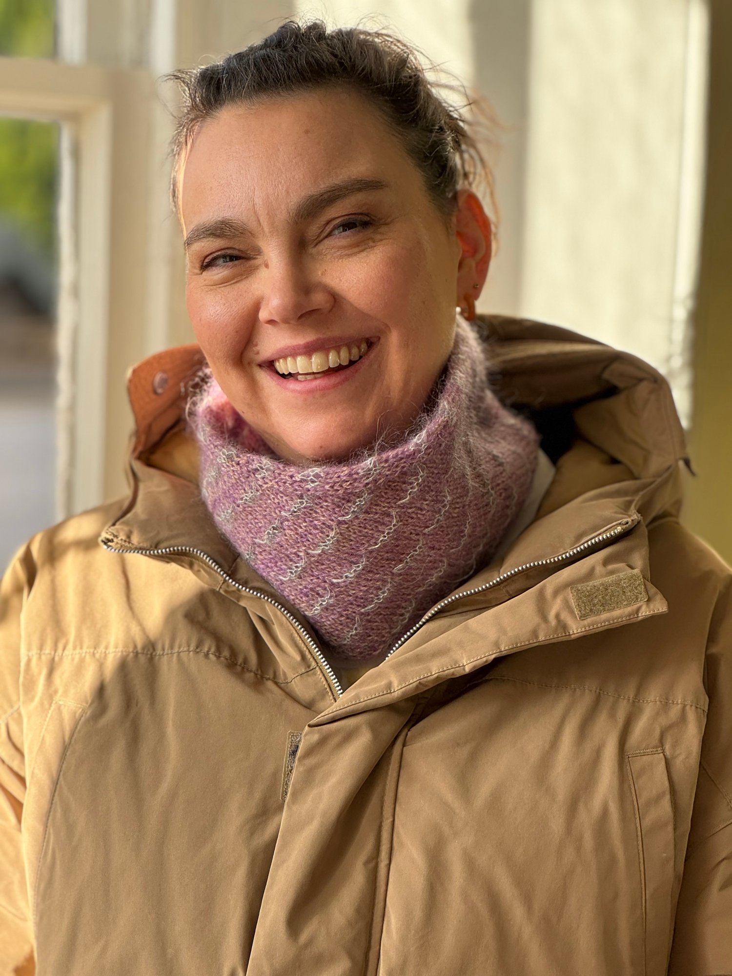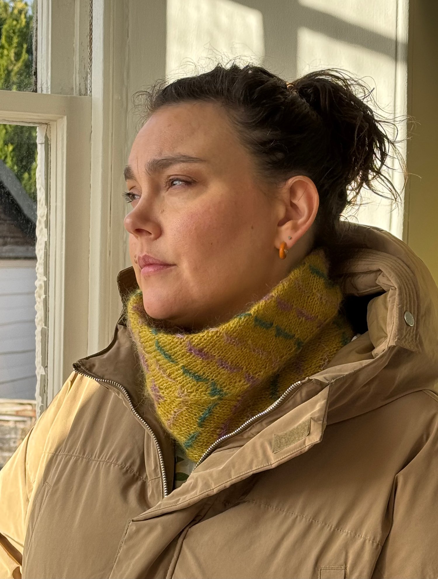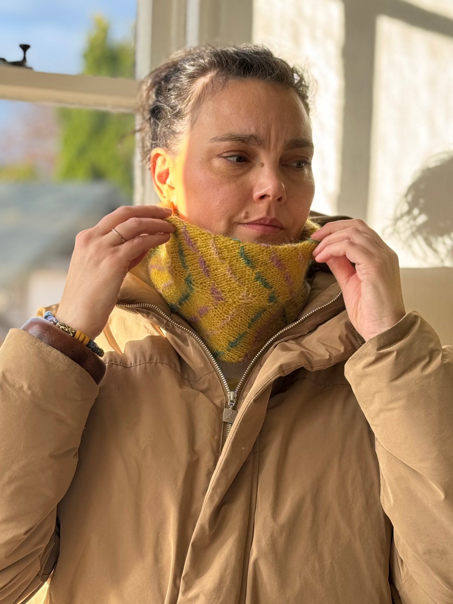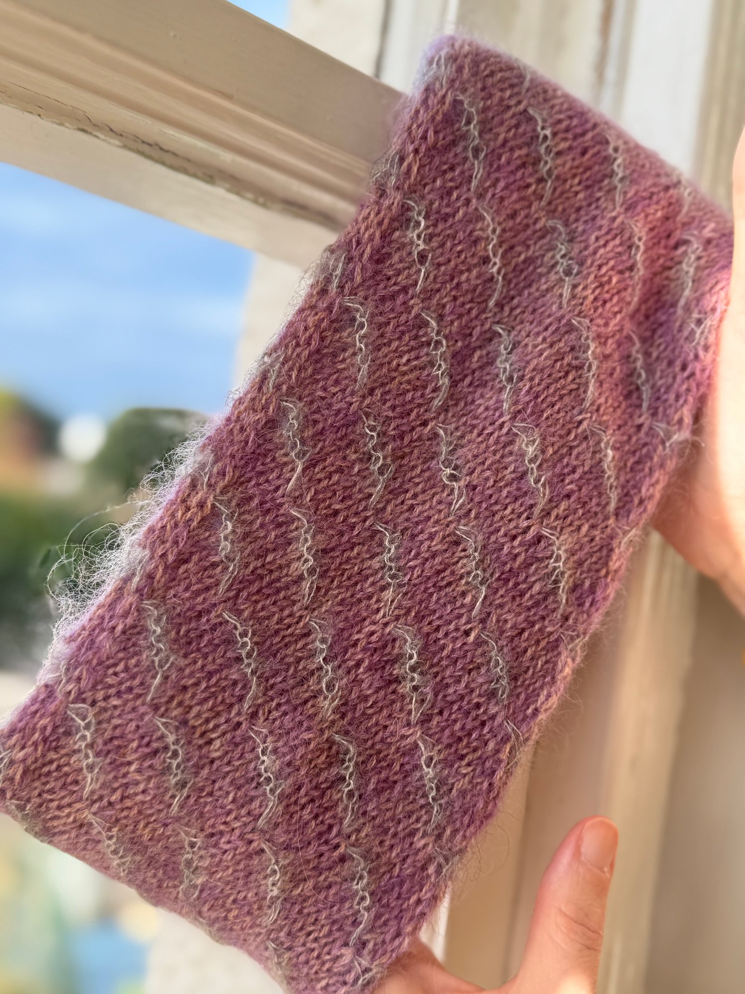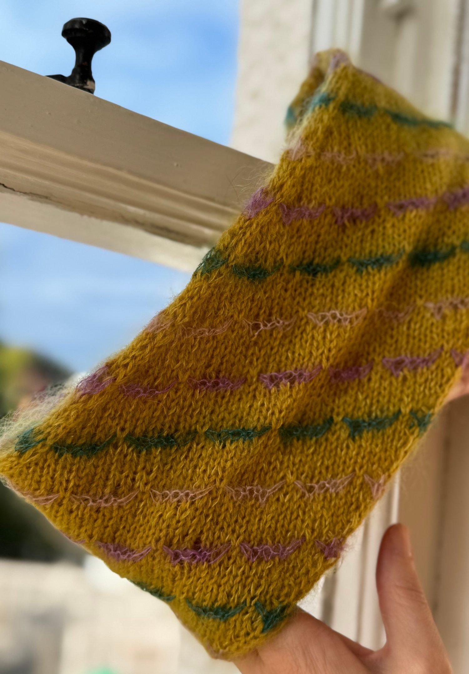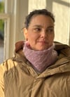 The Mene Cowl is a great canvas for using up small leftovers of mohair silk laceweight yarn, with each 2-round stripe of CC using only 0.25g. As there are 18 of these 2-round stripes, you could create a pattern of coloured stripes (as seen in mustard sample). Perhaps 9 colours with two stripes each or 3 colours with 6 stripes each? The possibilities are endless!