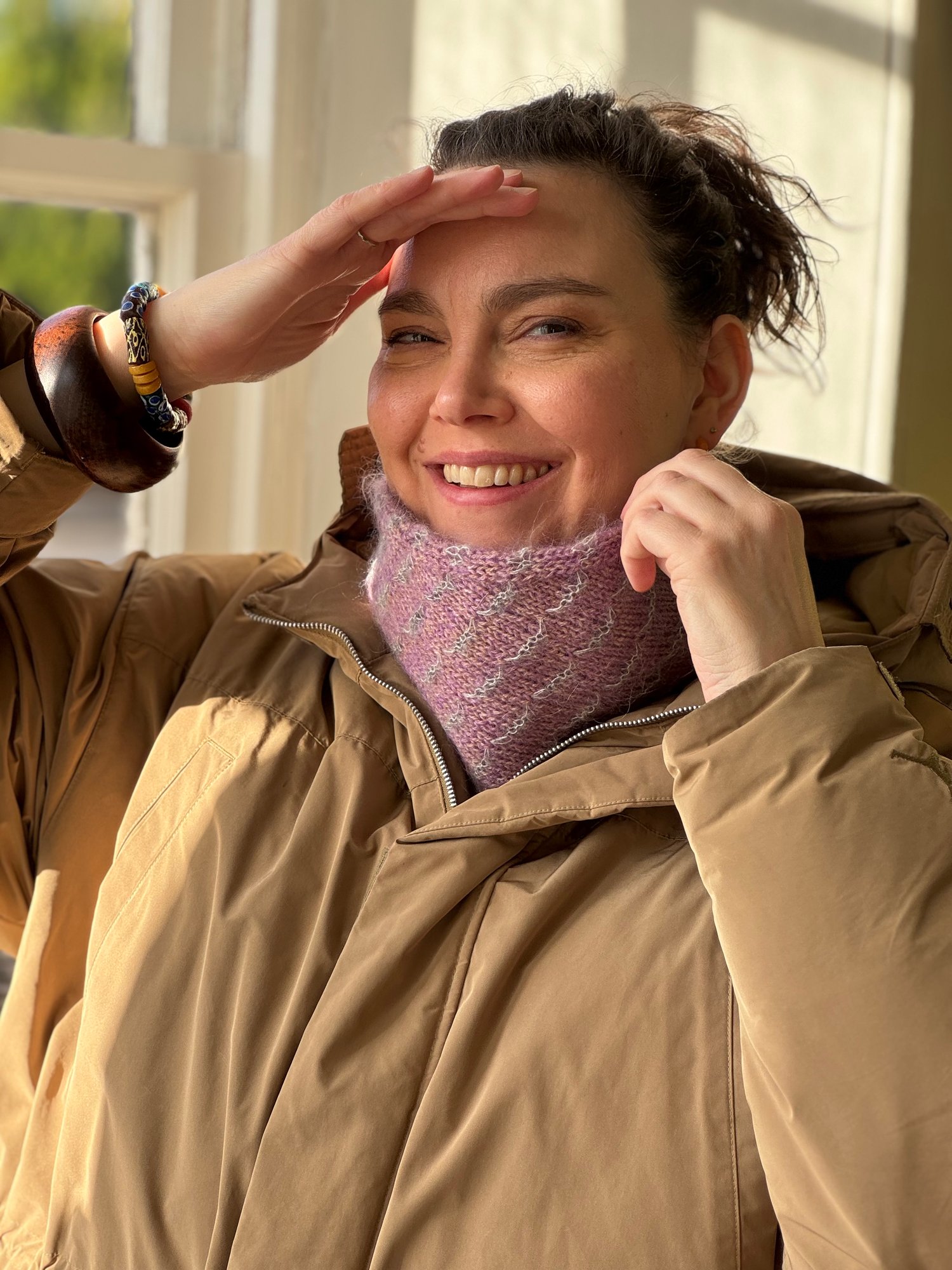 Look up into a clear sky on a cold winter night and you might spot Mene, the Greek lunar goddess, also known as Selene, driving her moon chariot across the heavens. With a hand knitted cowl around your neck, you are beautifully cosy as you indulge in some evening star gazing.