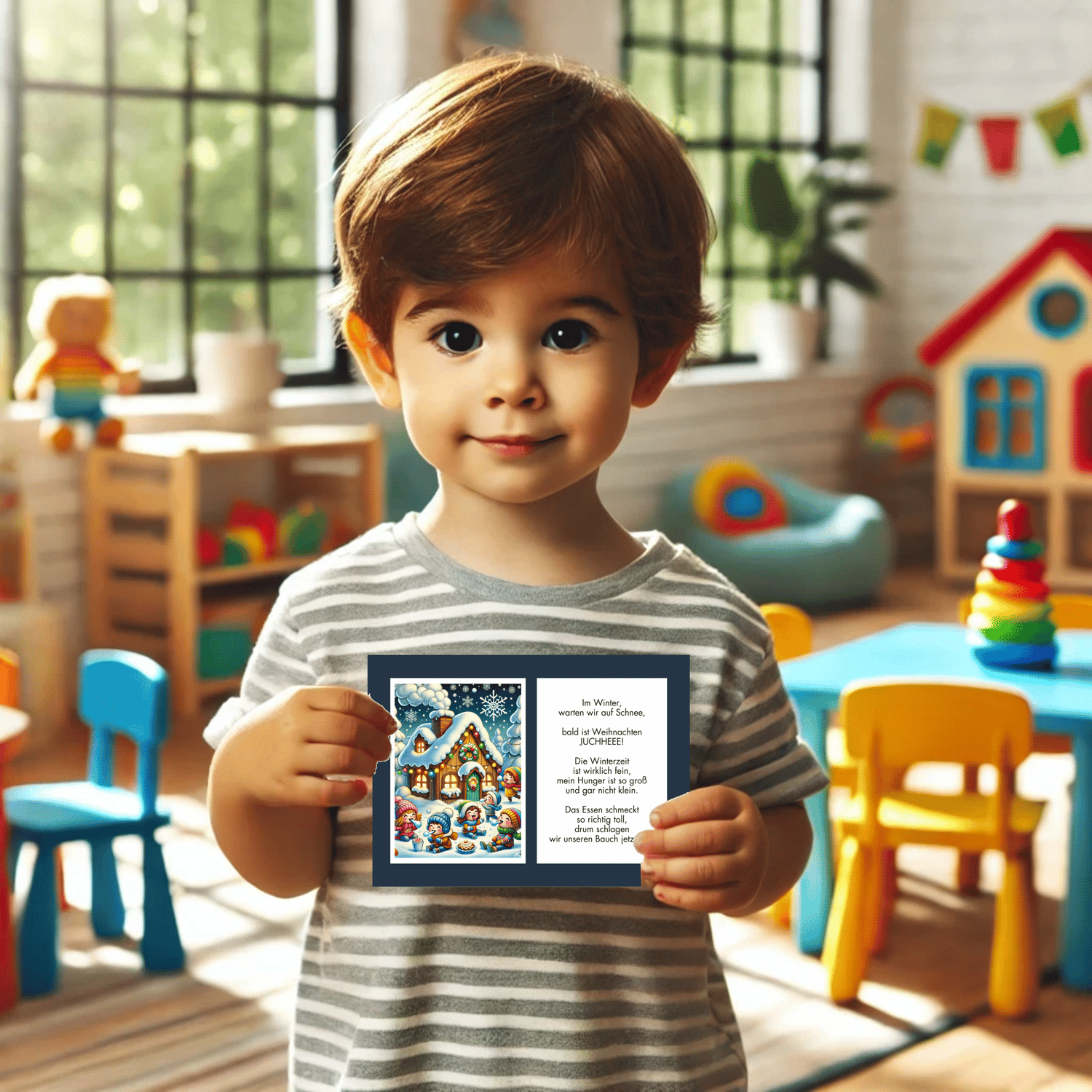 - Im Winter, warten wir auf Schnee: Ein fröhlicher Reim, der die winterliche Stimmung und den Appetit der Kinder widerspiegelt.