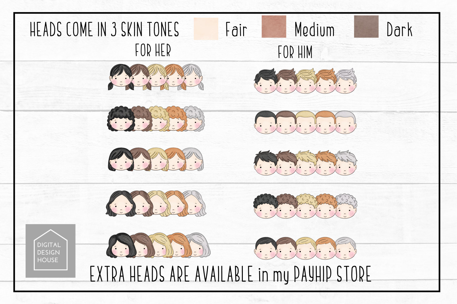 - 5 male heads in 5 hair colours (black, brown, blonde, ginger and grey) (in the 3 skin tones)