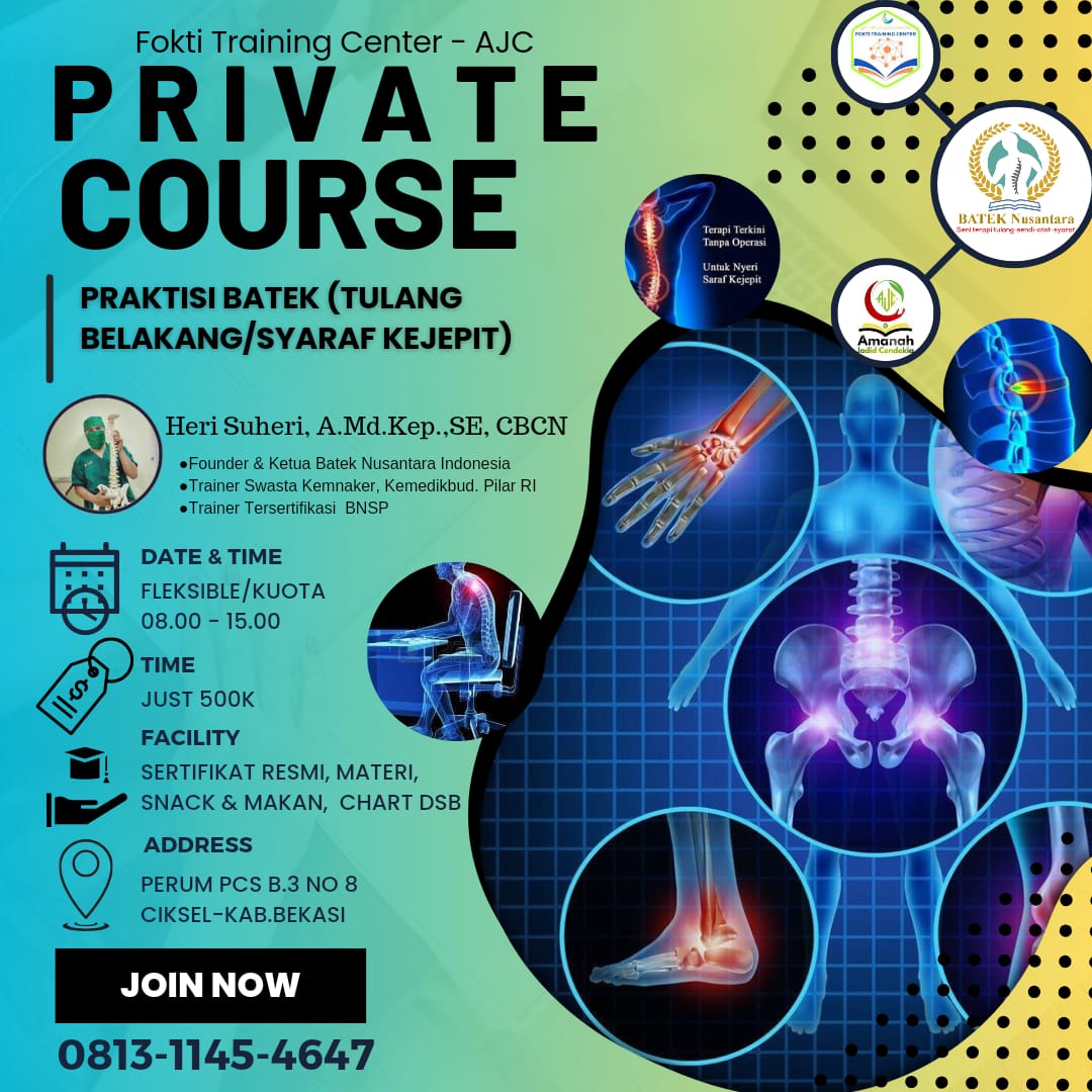 Pelatihan pembetualn tulang belakang atau syaraf kejepi atau HNP yang dikenal dengan BATEK, tehnik dan SOP yang aman, cepat dan tepat, sehingga dapat menjadi rekomendasi atau terapi yang sangat membantu semua masalah tulang belakang, syaraf, otot dan sendi (Muskoleskeletal)