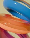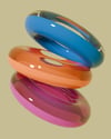 Inflated Rings: Two 3D illustrations of 3 translucent & colored rings floating, giving the sense of clean, lighted volume, offering the sense of cooling fun.