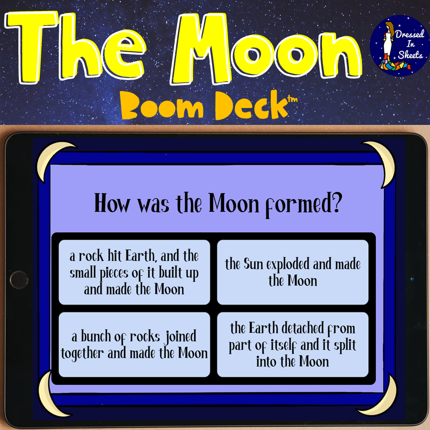 How old is the moon? How did it form? What is it made up of? And why does it affect the Earth's tidal waves? Find out the answer to ALL these questions and more with this informative BOOM deck. We are living in history right now as we find out there is water in the Moon and how this can affect future space missions. This BOOM deck contains 5 questions at the end. Perfect for small group discussions, science lessons, substitute days, and more.