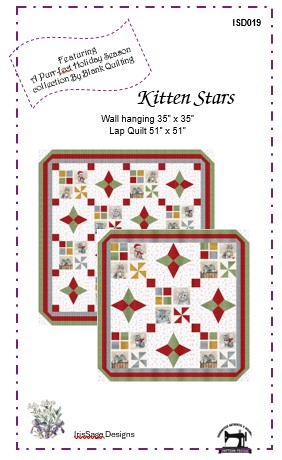 Simple blocks and some fussy cut squares combine to showcase A Purr-fect Holiday Season Fabrics by Blank Quilting. The stars are paper pieced or use can alternately use the Studio 180 V Block Timmer ruler to make the blocks. The blocks that look like a 4-patch are what the actual fabric is. You could make 4-patch blocks instead, the size is indicated in the pattern.
