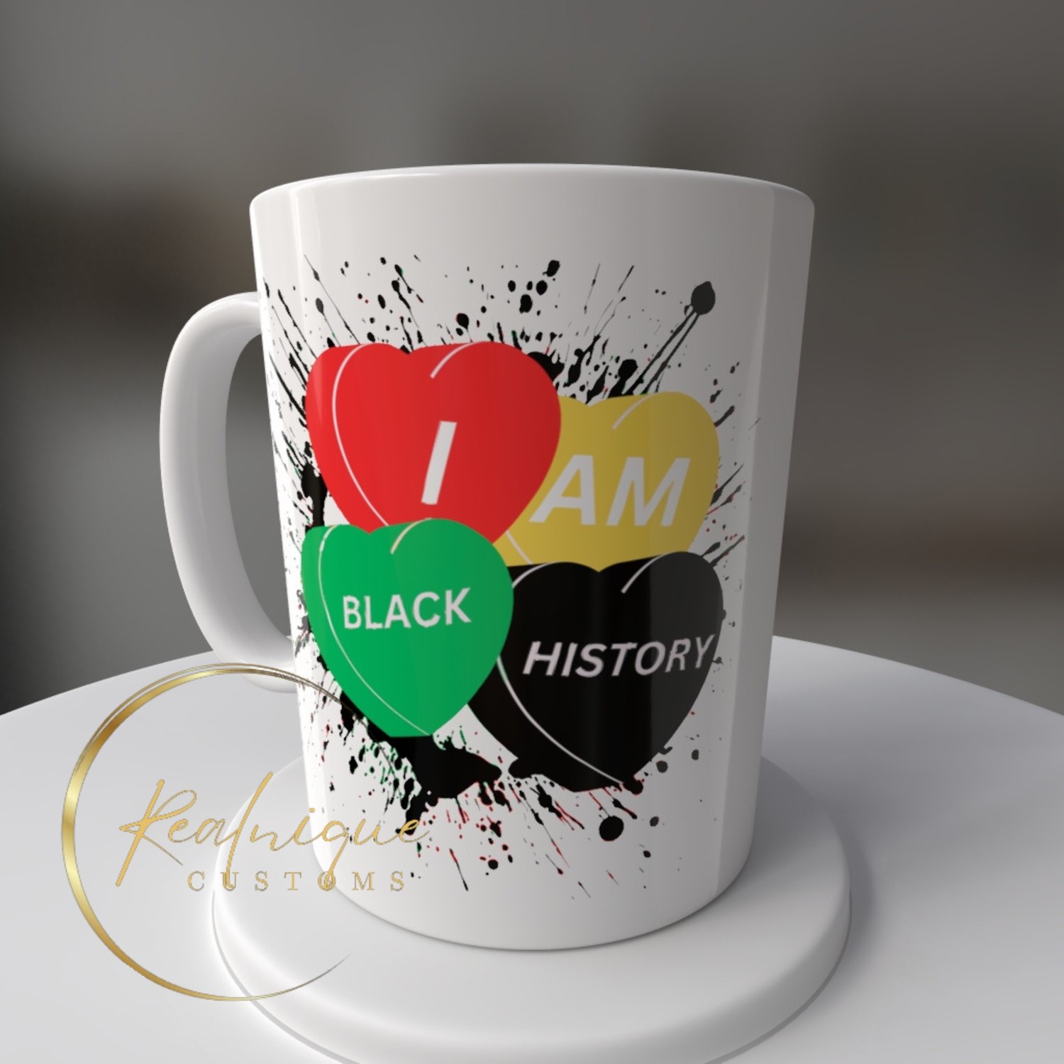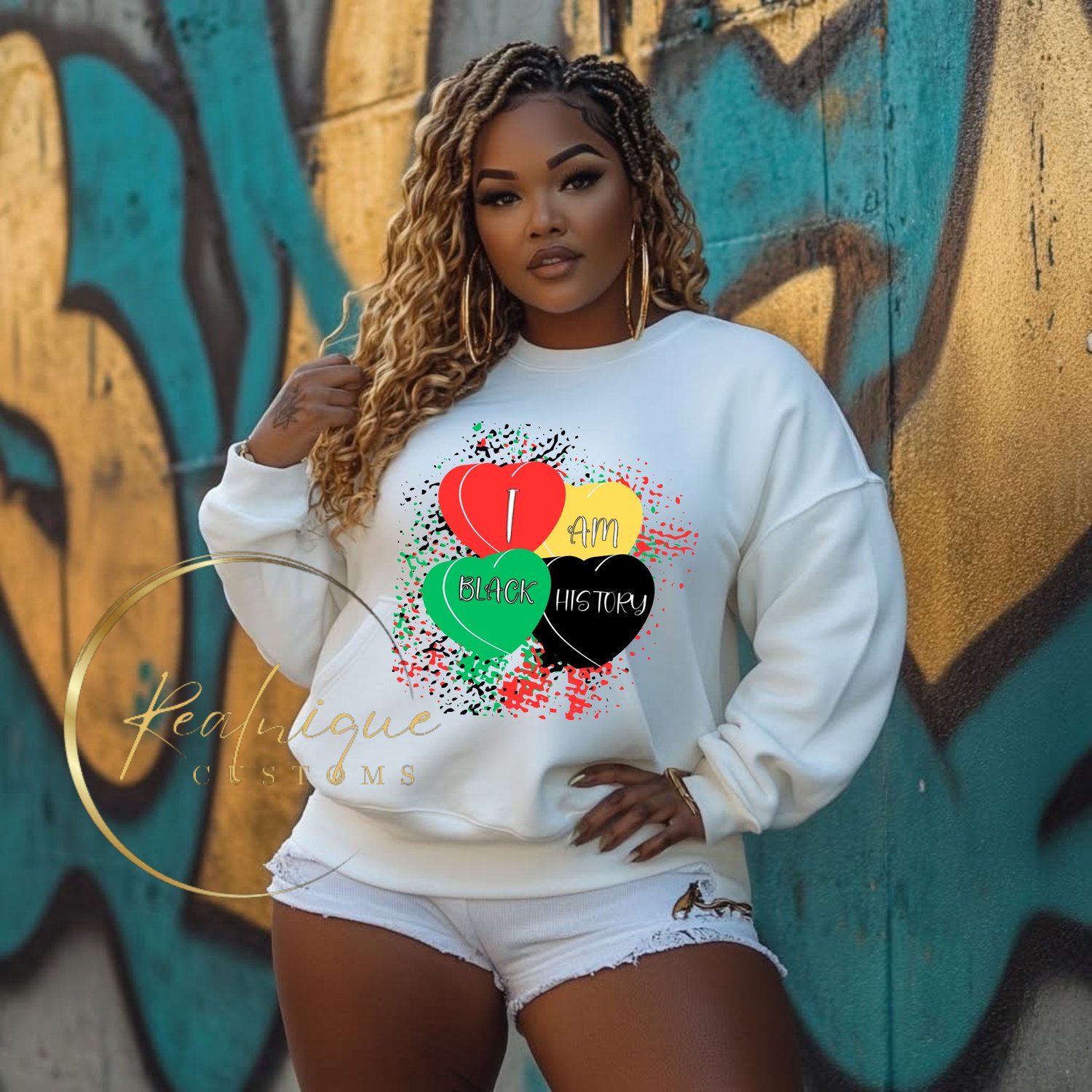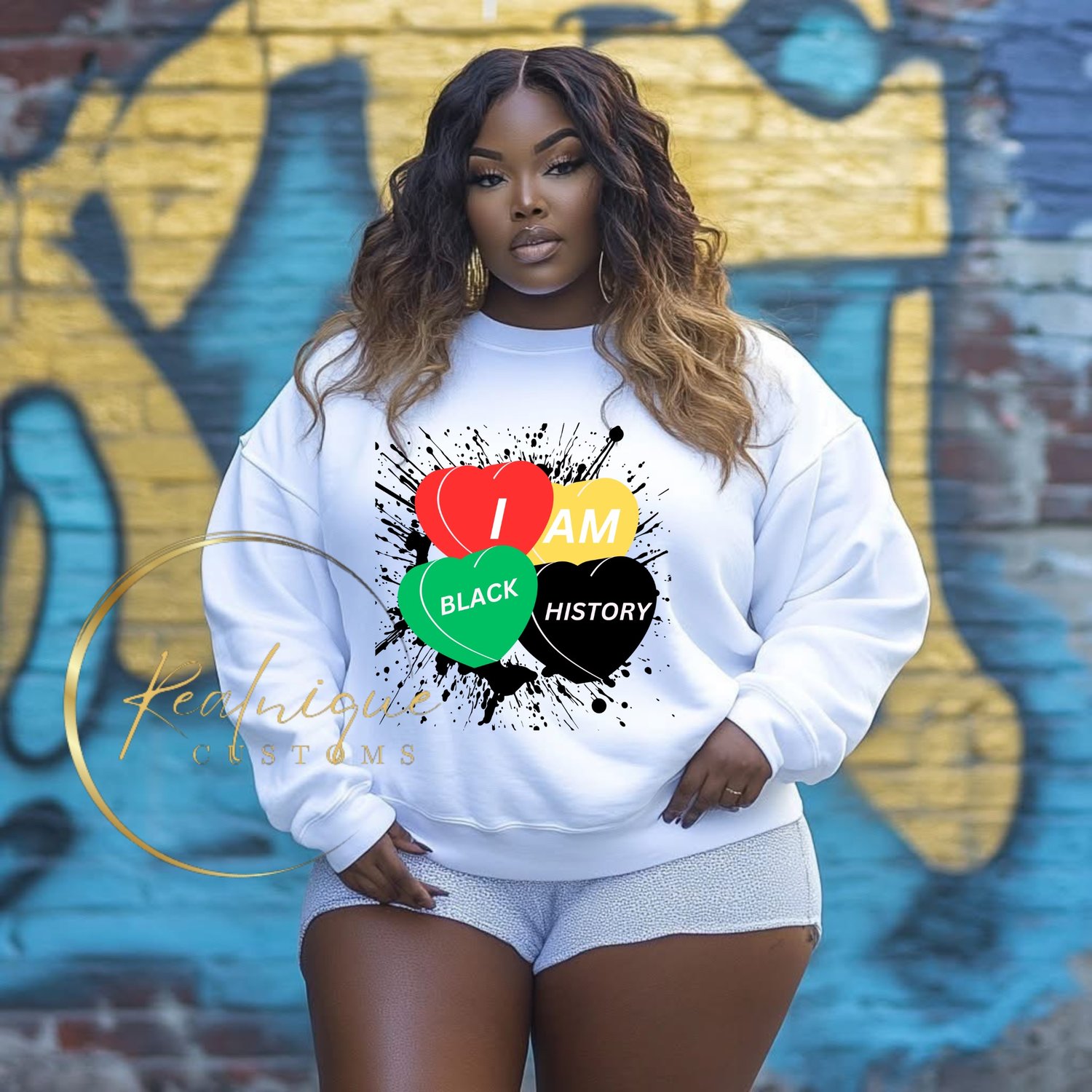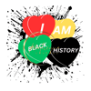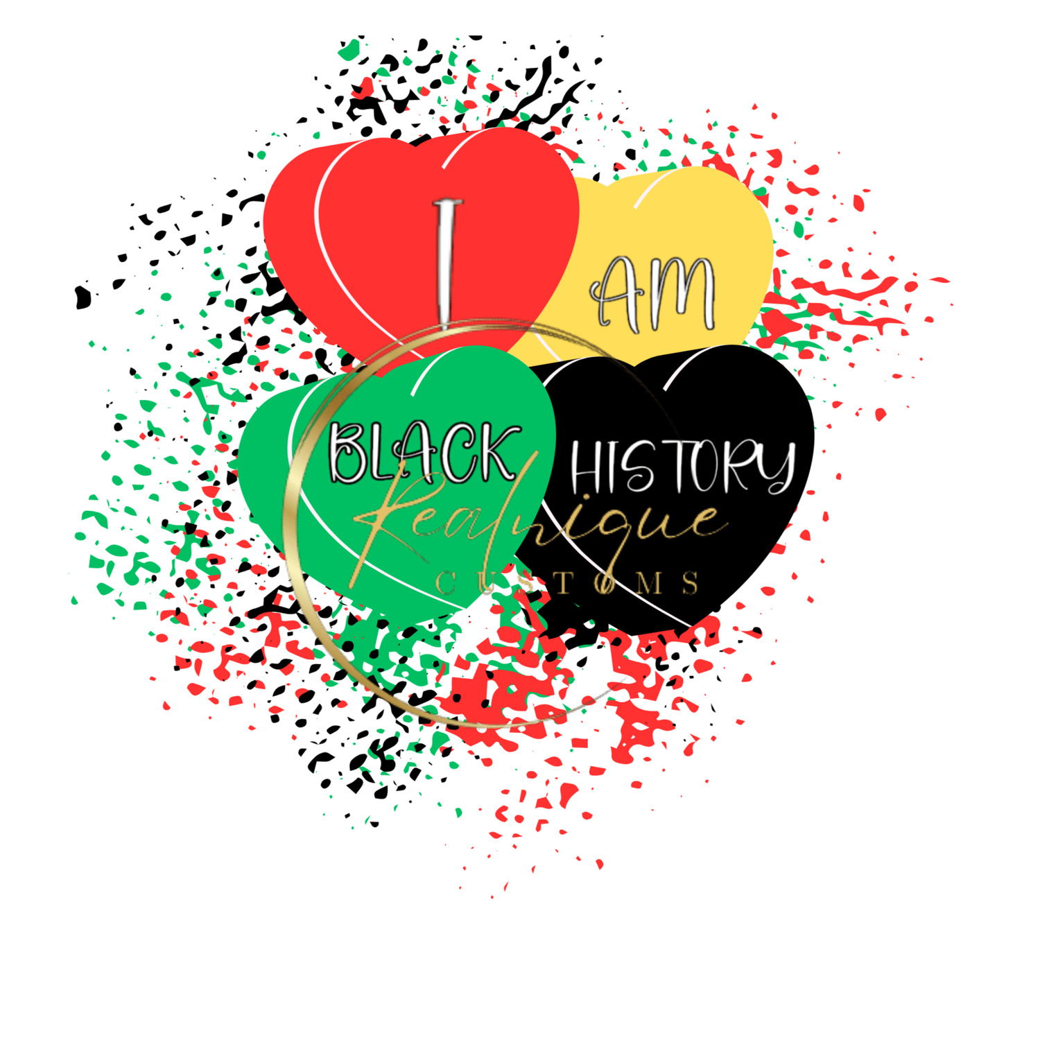 This vibrant design features hearts in Pan-African colors—red, yellow, green, and black—splattered against a bold black ink background. The statement "I AM BLACK HISTORY" is prominently displayed, celebrating Black identity, resilience, and contributions to history. The energetic splatter effect adds a modern, expressive touch.