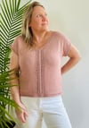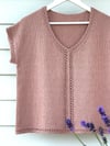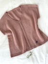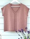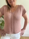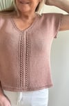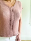 The soft rounded V-neck merges at a perfect depth and flows into the body to carry the riptide stitch pattern via a central panel to the hem, where the tee is finished with a simple garter and eyelet stitch.