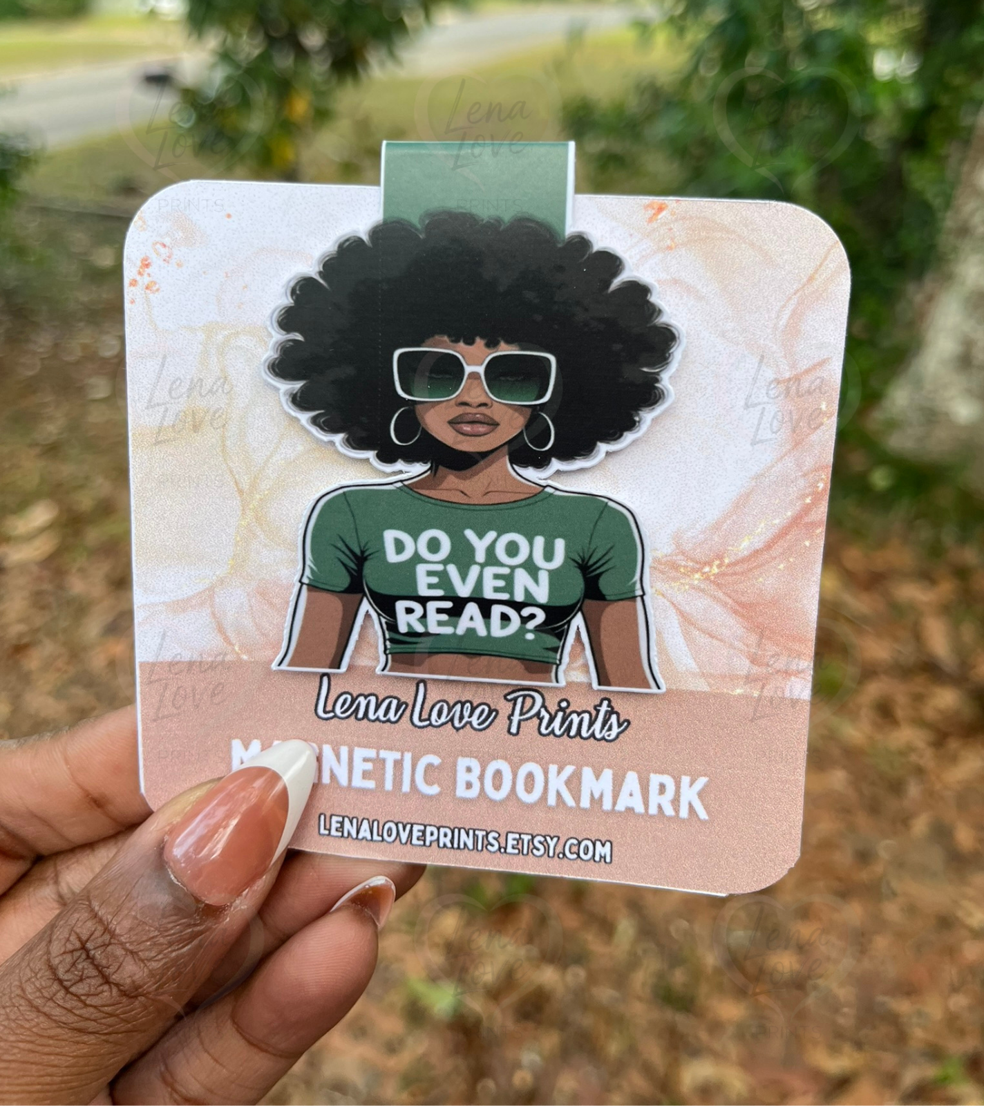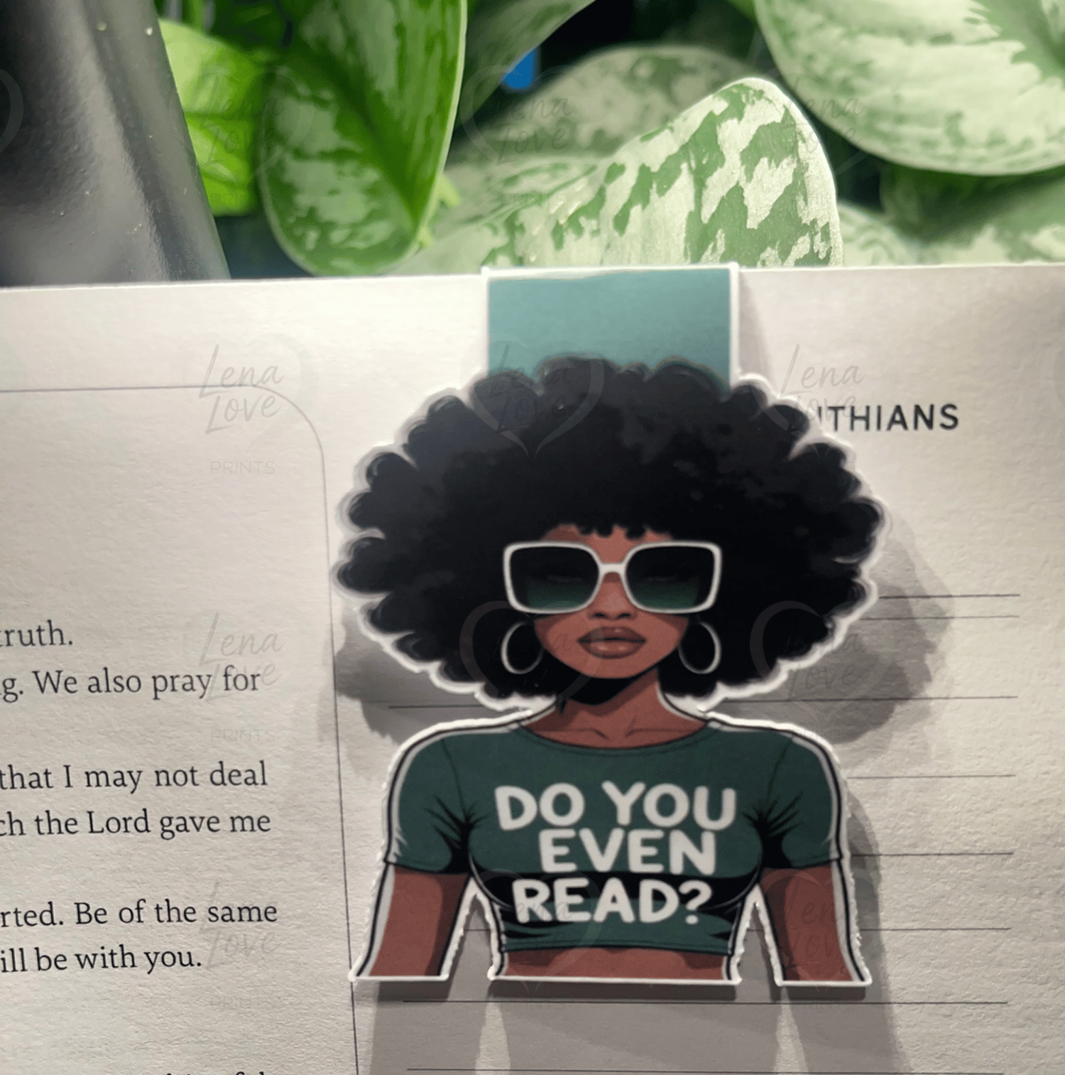 These magnetic bookmarks celebrate the beauty and power of Black women, featuring a bold illustration of a woman with a fabulous afro, stylish sunglasses and long nails holding open her book. Made from sturdy cardstock with strong magnets, they keep your place secure without slipping or damaging your pages.