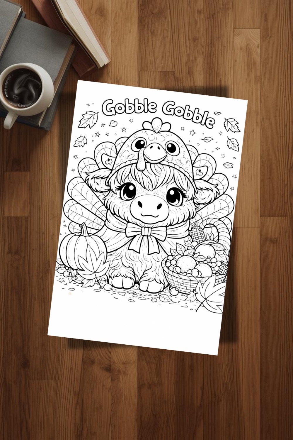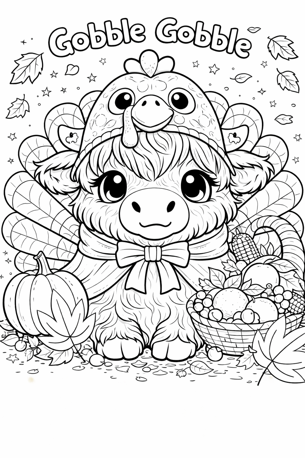 Bella Moo is dressed up in her adorable turkey costume and ready for Thanksgiving fun! Surrounded by pumpkins, falling leaves, and a cozy harvest basket, this sweet Highland cow coloring page is perfect for celebrating the season.