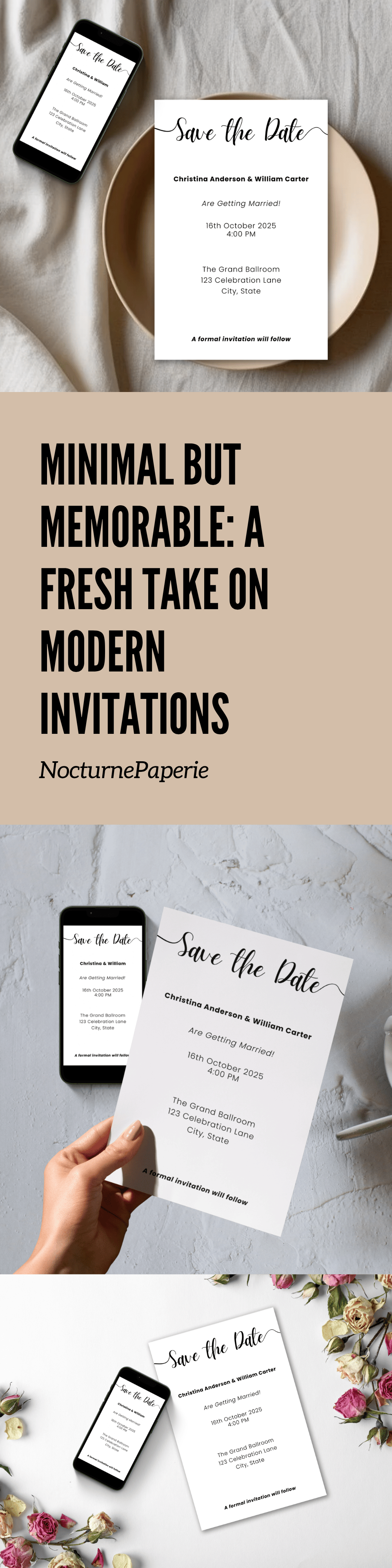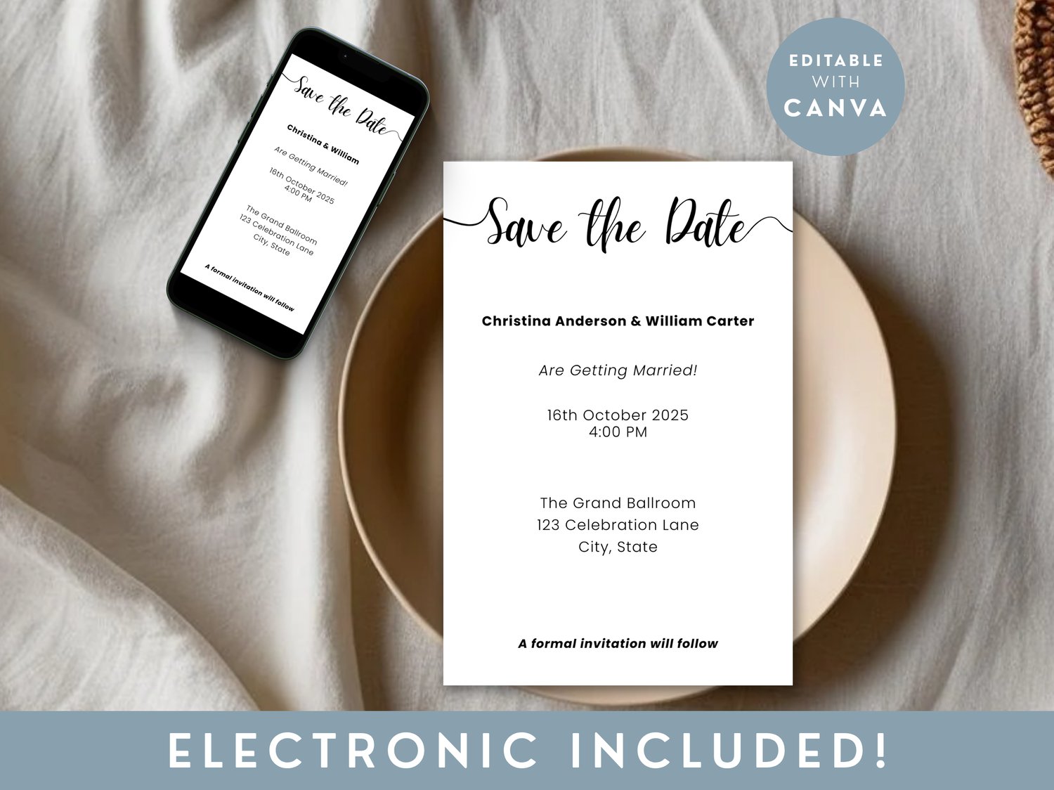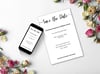 Keep your announcement simple and stylish with this minimalist Save The Date digital wedding invitation. This editable Canva template features a clean layout, perfect for inviting guests with a printable Save The Date card.