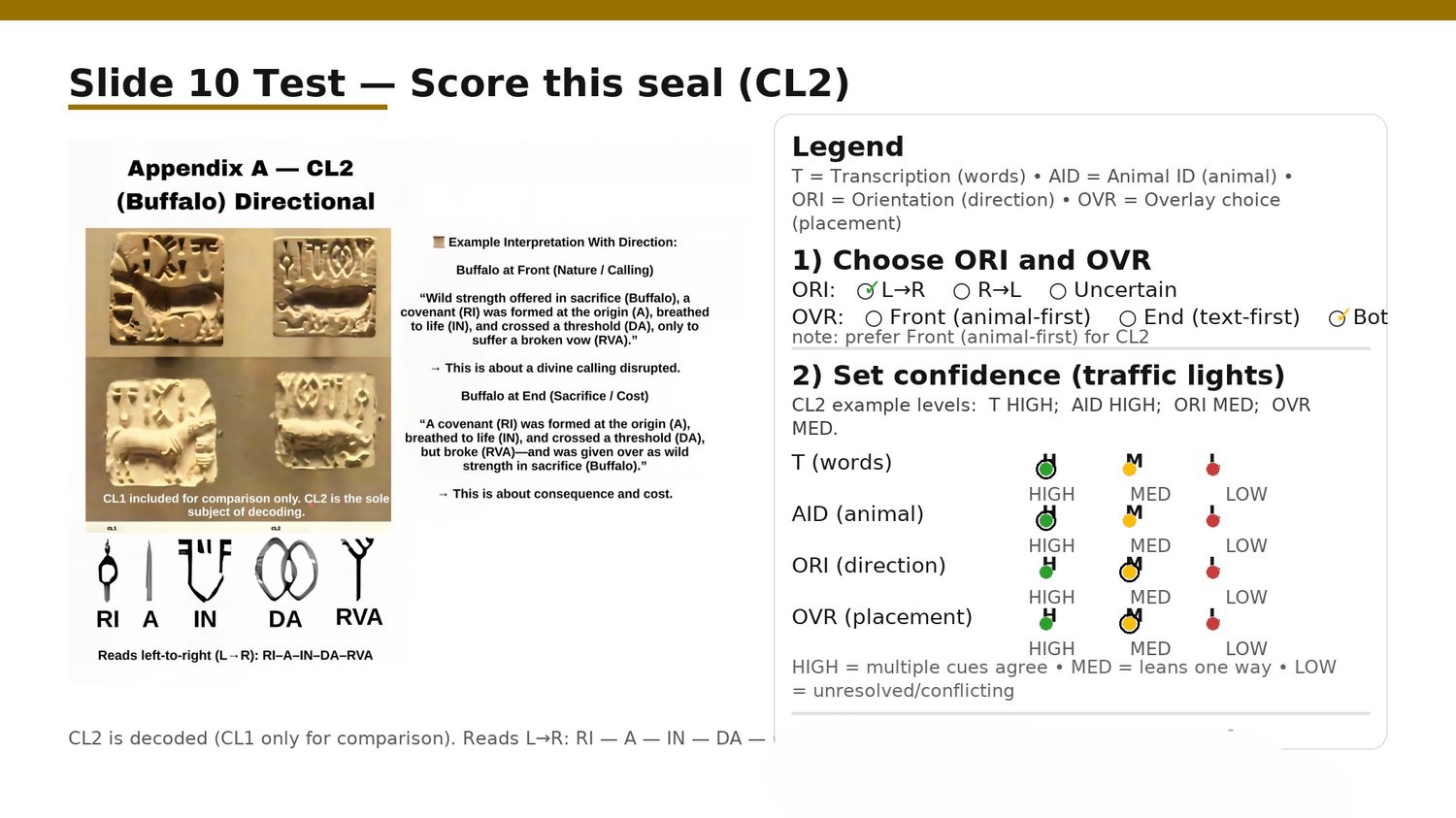 This pack comes from my ongoing Indus Script project: a reproducible, four-lane method for reading seals—ORI (reading direction), OVR (animal vs. text placement), T (words/lexemes), and AID (animal classifier)—with a traffic-light confidence rubric (HIGH/MED/LOW). The goal is simple: make the process teachable, testable, and repeatable. For context and credibility, I’ve included the CL2 slide from my New Delhi conference materials and a redacted ASI thank-you letter (invitation ≠ endorsement).