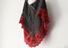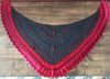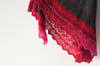 This is a top down triangular wrap. The body includes some texture using simple knit and purl stitch combinations and some contrast colour for effect. The contrast colour is mainly used to work the lace pattern as well as an applied lace edge bind off.