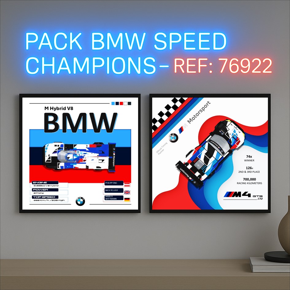 This pack includes both posters inspired by the LEGO Speed Champions set BMW M4 GT3 & BMW M Hybrid V8 (Ref. 76922).