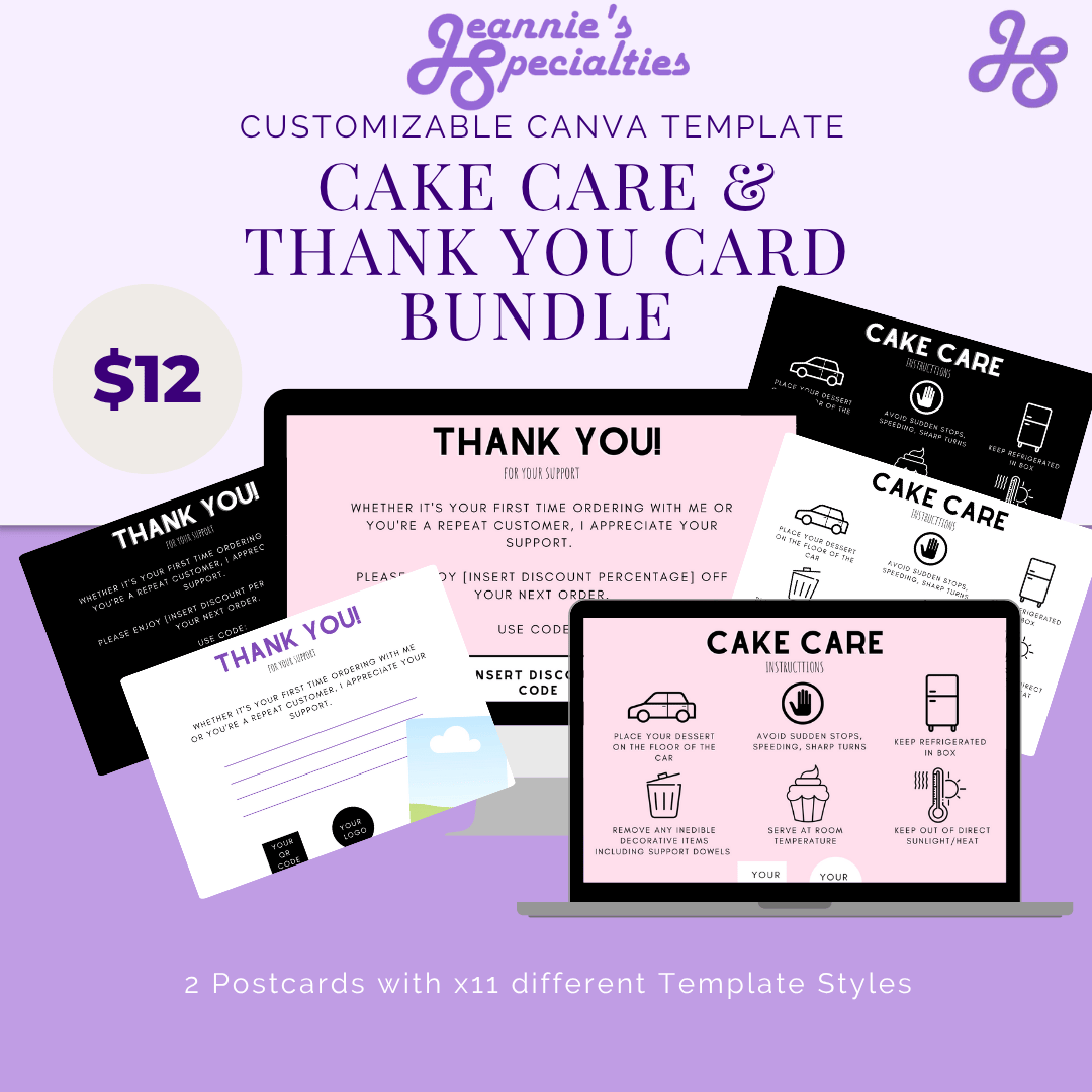 This Template is already done for you! Fully customizable template to create your own Cake Care & Thank You Cards, perfect for adding to each of your orders.