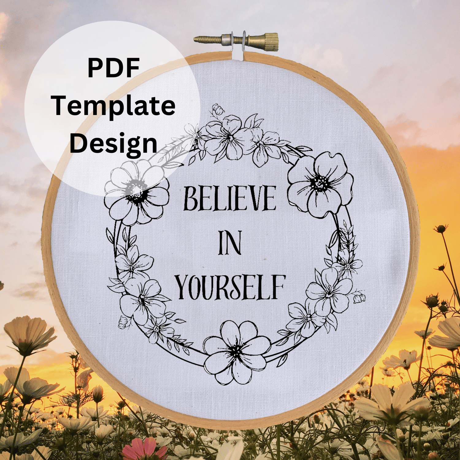 Stitch this beautiful motivational quote "Believe In Yourself" wreath pattern with this charming hand embroidery project. This project is perfect for beginners and advanced stitchers alike, as it is a simple and fun design that allows you to choose the stitches and colors.