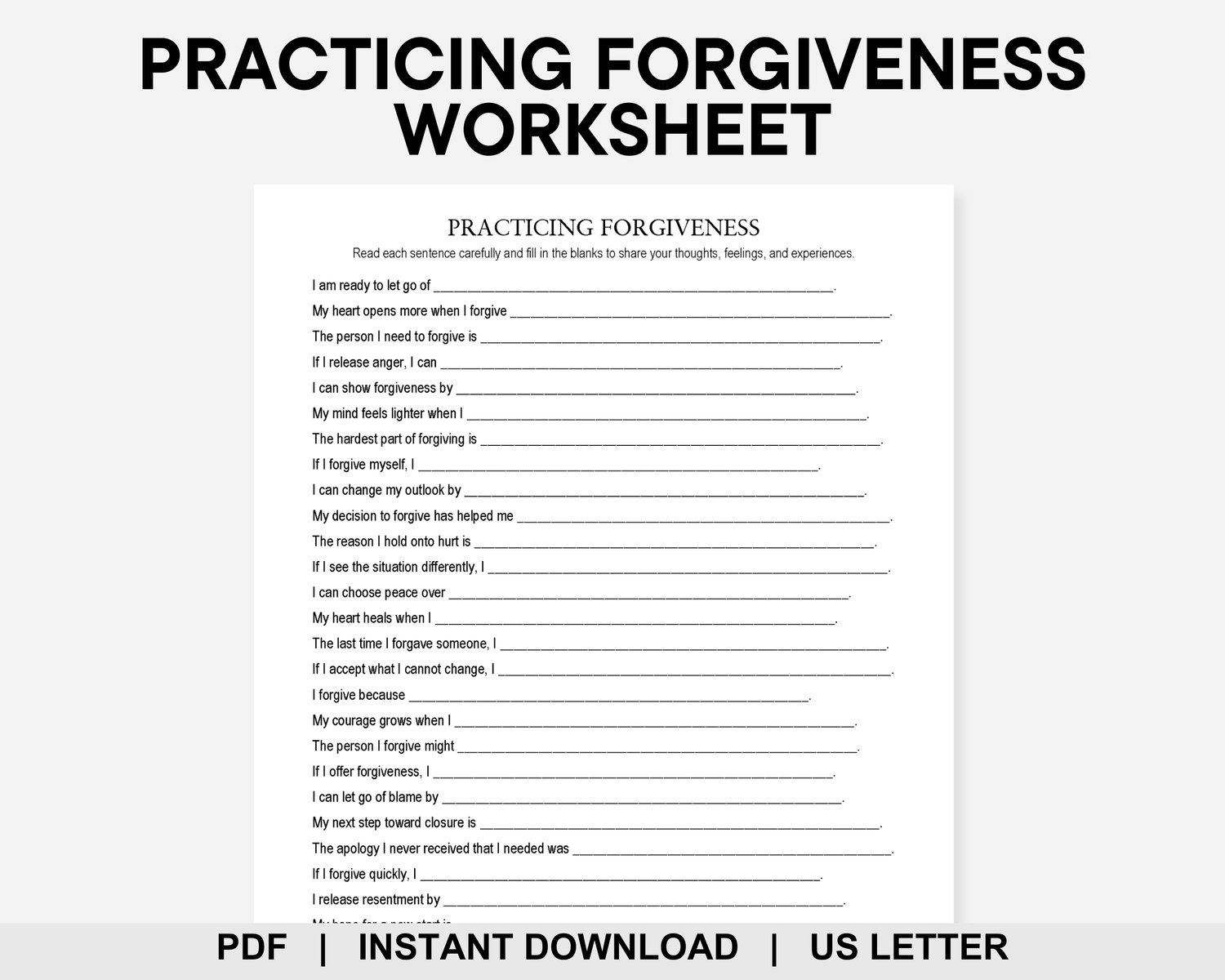 How wonderful would it feel to finally let that old hurt go? This Practicing Forgiveness worksheet features 30 prompts to guide you to explore past wounds and choose a future free from resentment. Use it for therapy sessions, journaling, or self-reflection to help shift your perspective and embrace a kinder way of being. Say goodbye to holding grudges and hello to a brighter, more present you!