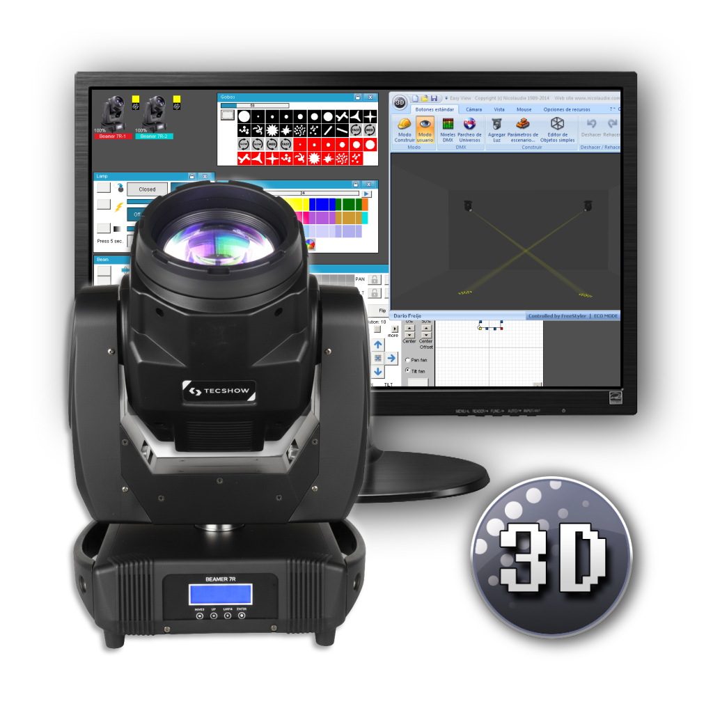 * Esta librería no reemplaza al Fixture de Freestyler o QLC+, sino que es un complemento para ver las secuencias en 3D. Es decir, hay que tener ya el Fixture de Freestyler o de QLC+ para los equipos.