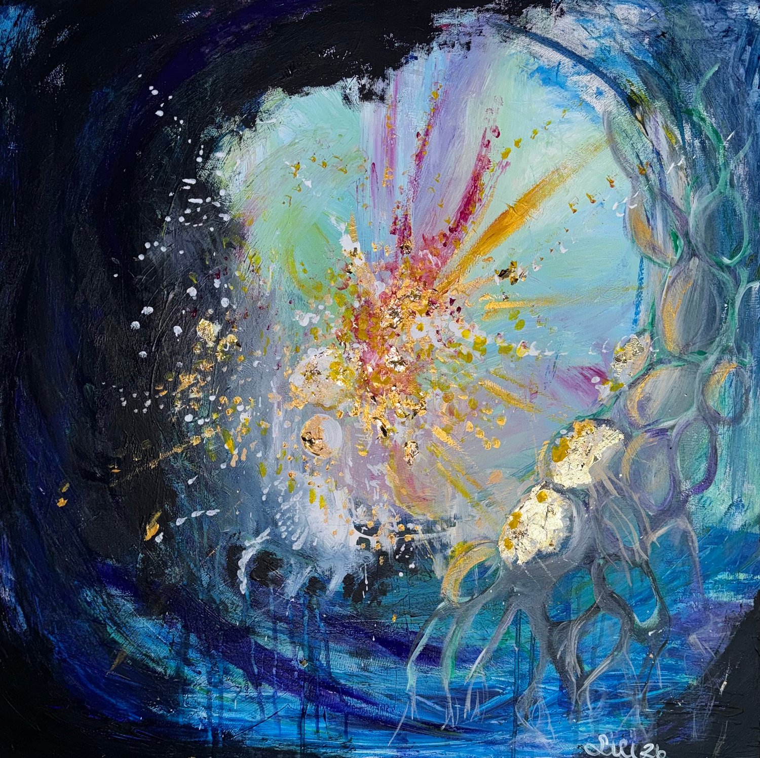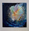 Birthing the New is an origin work—made at the moment my practice crossed a threshold and could not return to what it was before. The painting holds a charged stillness: a luminous center breaking open, matter reorganising itself around a new frequency. Blues and night-tones cradle the field; gold ignites it, not as ornament, but as signal—where intention condenses into form.