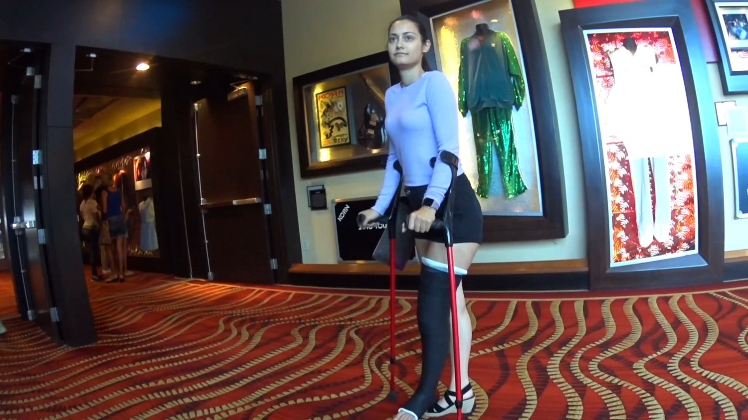 Elisabeth is crutching out from the Hard Rock Casino and back to the parking garage with a black LLC on her