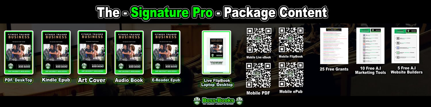 Fitness Trainer Business - Signature Pro - With Audiobook / Mobile QR Codes / 10 Free A.I Tools / 25 Grant List / 5 Free A.I Website Builders & More