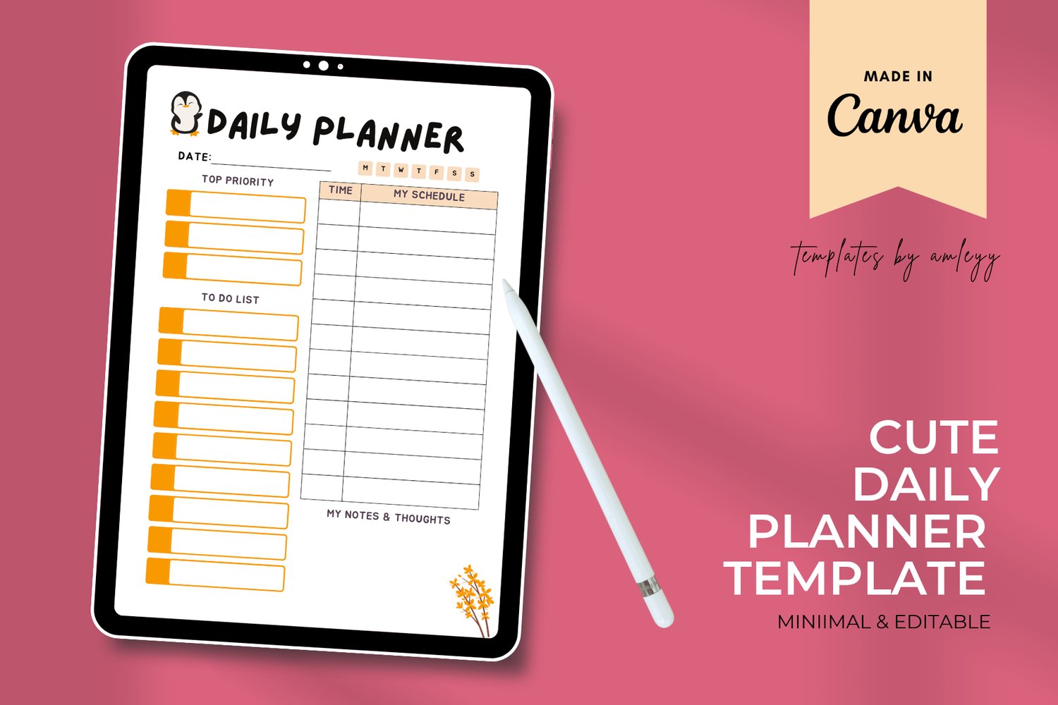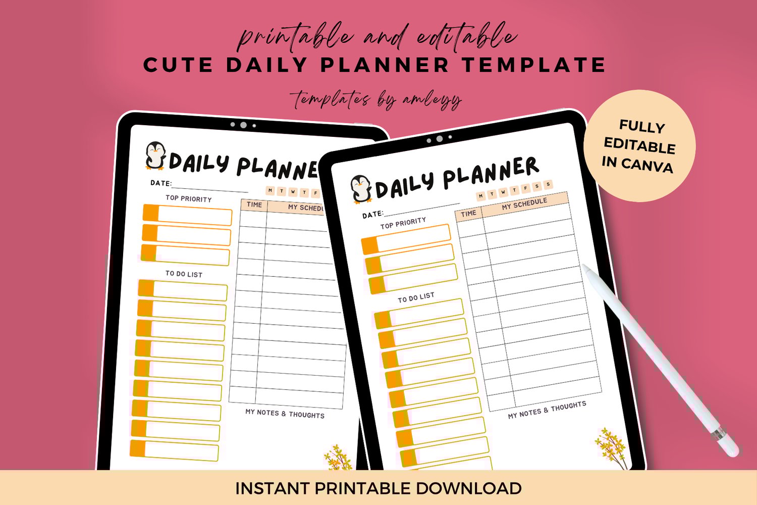 Canva Editable Daily Planner Template, Cute Penguin & Orange Aesthetic, Priority List & Hourly Schedule