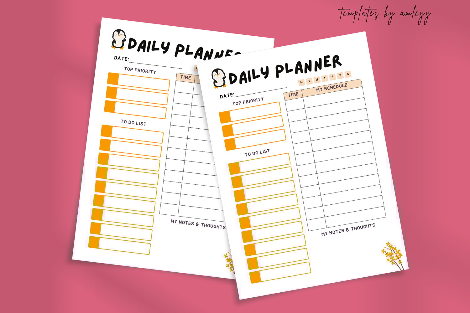 Say goodbye to dull planning! This Cute Penguin Daily Planner Template brings a cheerful, vibrant design to your organizational routine. Featuring a playful penguin mascot and bright orange accents, this planner makes productivity fun for kids, students, or anyone who loves a cute aesthetic.