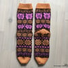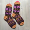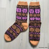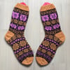 Method: These stranded colorwork socks are knit in the round from the cuff down with a round heel and gusset decreases placed on the sole. These socks can be knitted on dpns, short circular (you will still need dpns for the heel and toe decreases), or by magic loop.