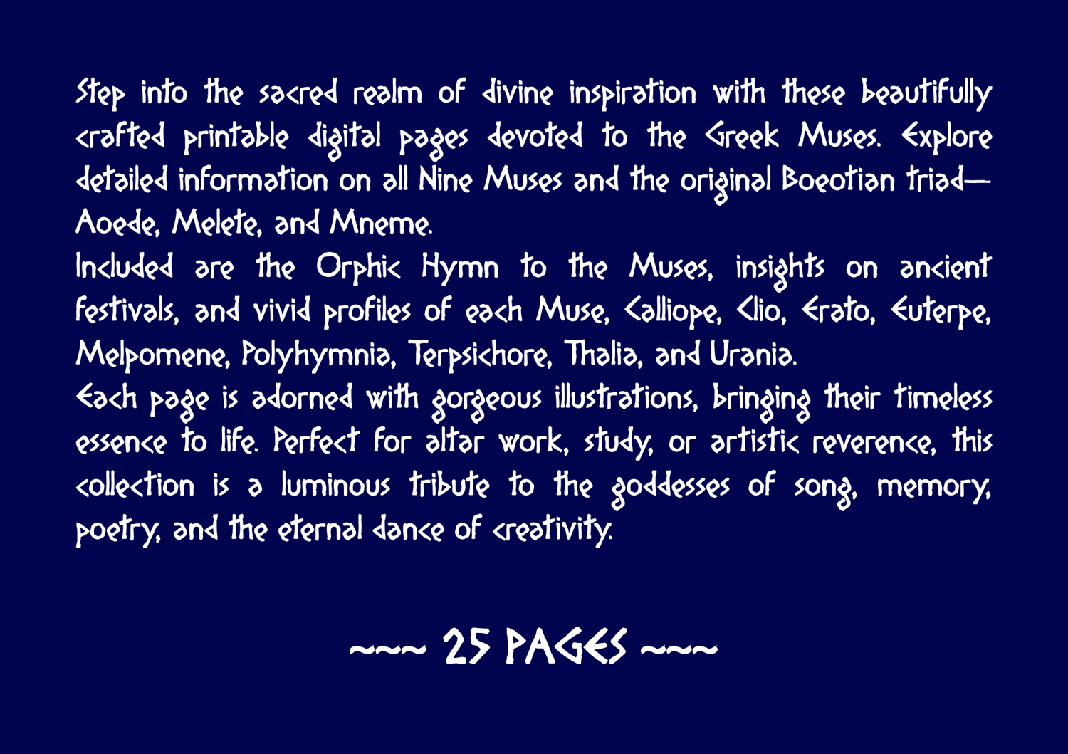 Each page is adorned with gorgeous illustrations, bringing their timeless essence to life. Perfect for altar work, study, or artistic reverence, this collection is a luminous tribute to the goddesses of song, memory, poetry, and the eternal dance of creativity.
