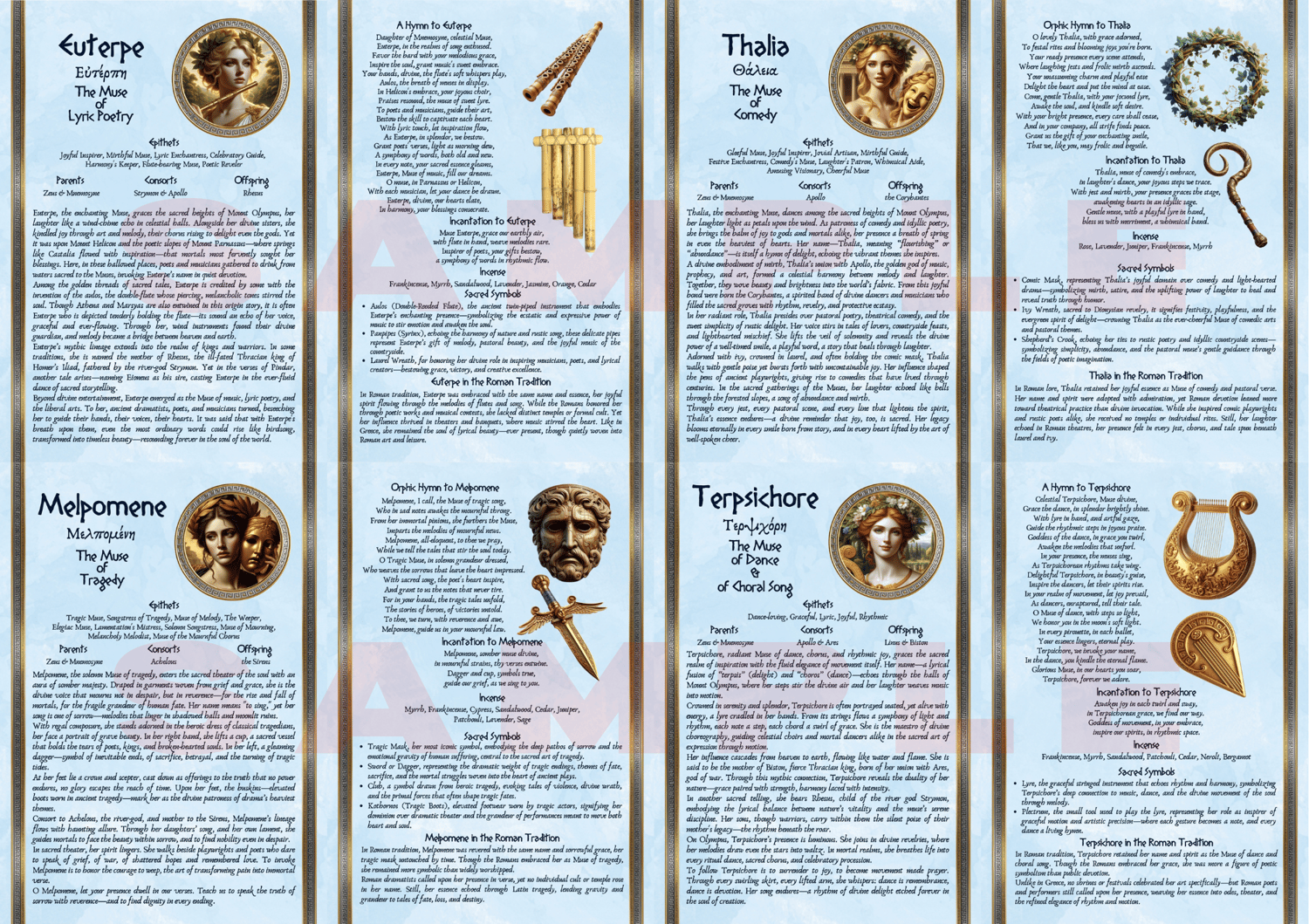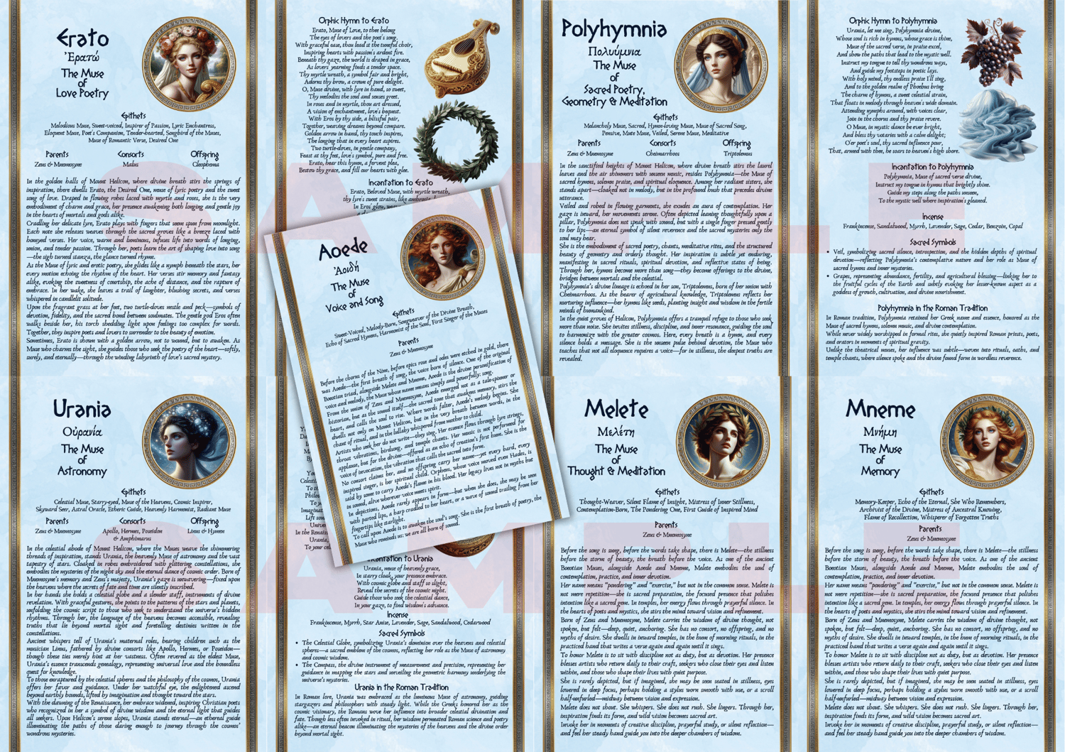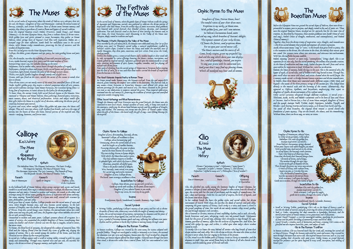 Step into the sacred realm of divine inspiration with these beautifully crafted printable digital pages devoted to the Greek Muses. Explore detailed information on all Nine Muses and the original Boeotian triad—Aoede, Melete, and Mneme.