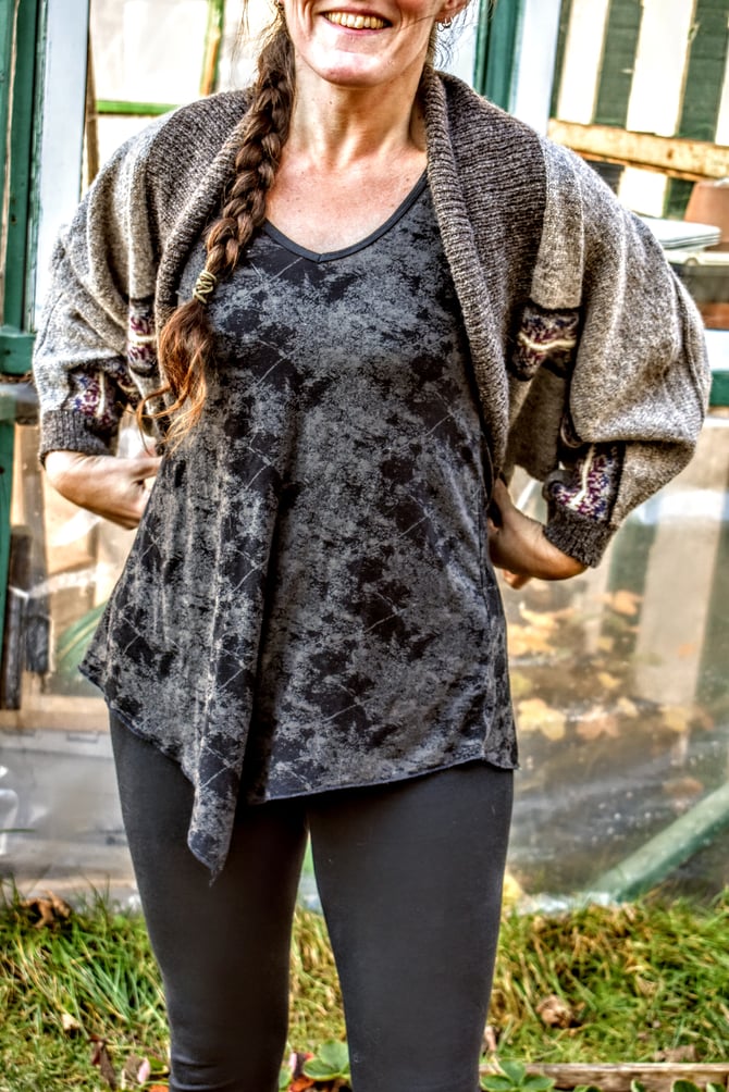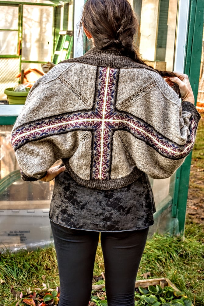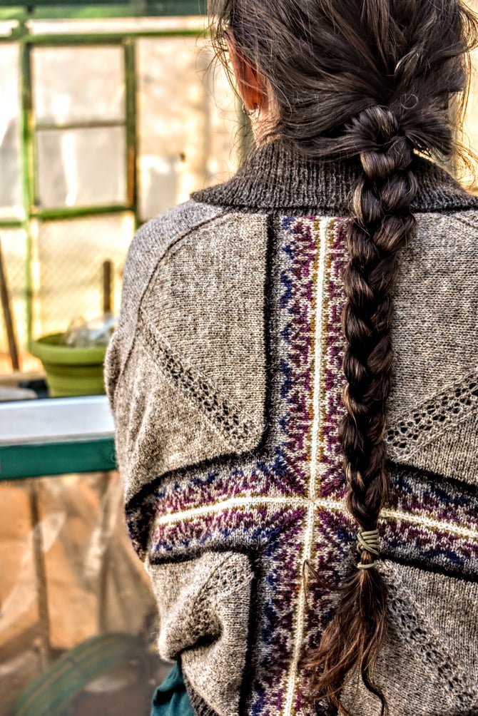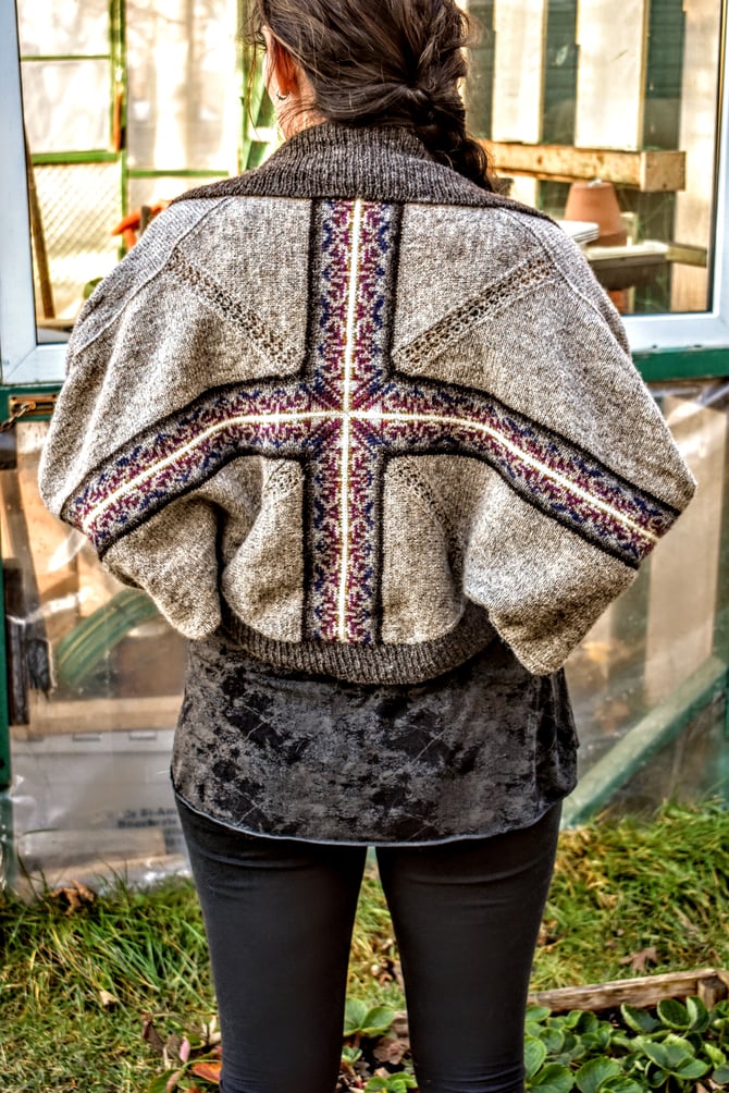 Part of the Noggin Cove Islands collection, the Noggin Point shrug is a roomy statement piece. The Fair Isle patterning on the back is mitered at four corners to form the central X motif. Complimentary simple bands of the Shetland Da Flee lace pattern extend outward from each miter, filling in the four squared corners. The pattern is written so that you can knit the stranded colourwork either in-the-round with steeks or flat with no steeks.