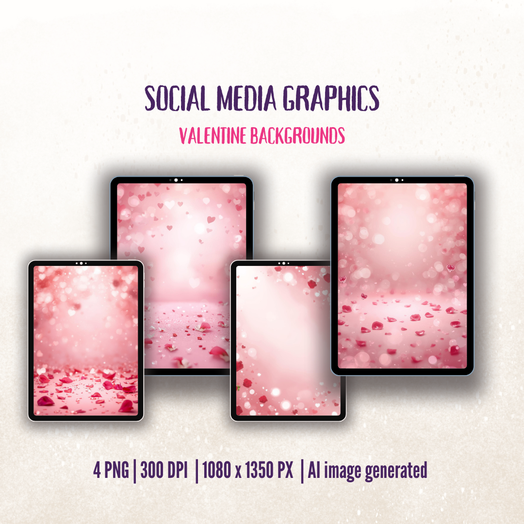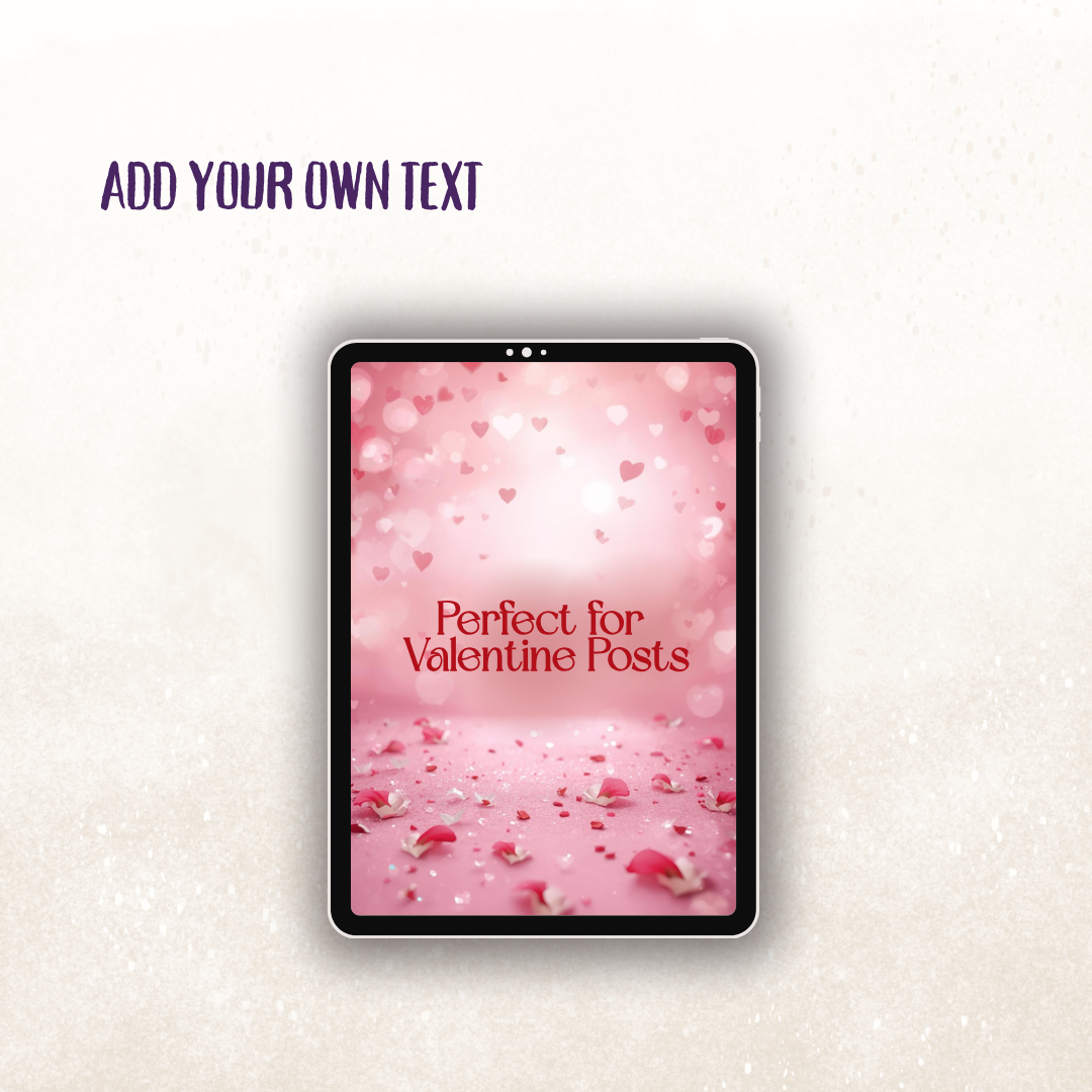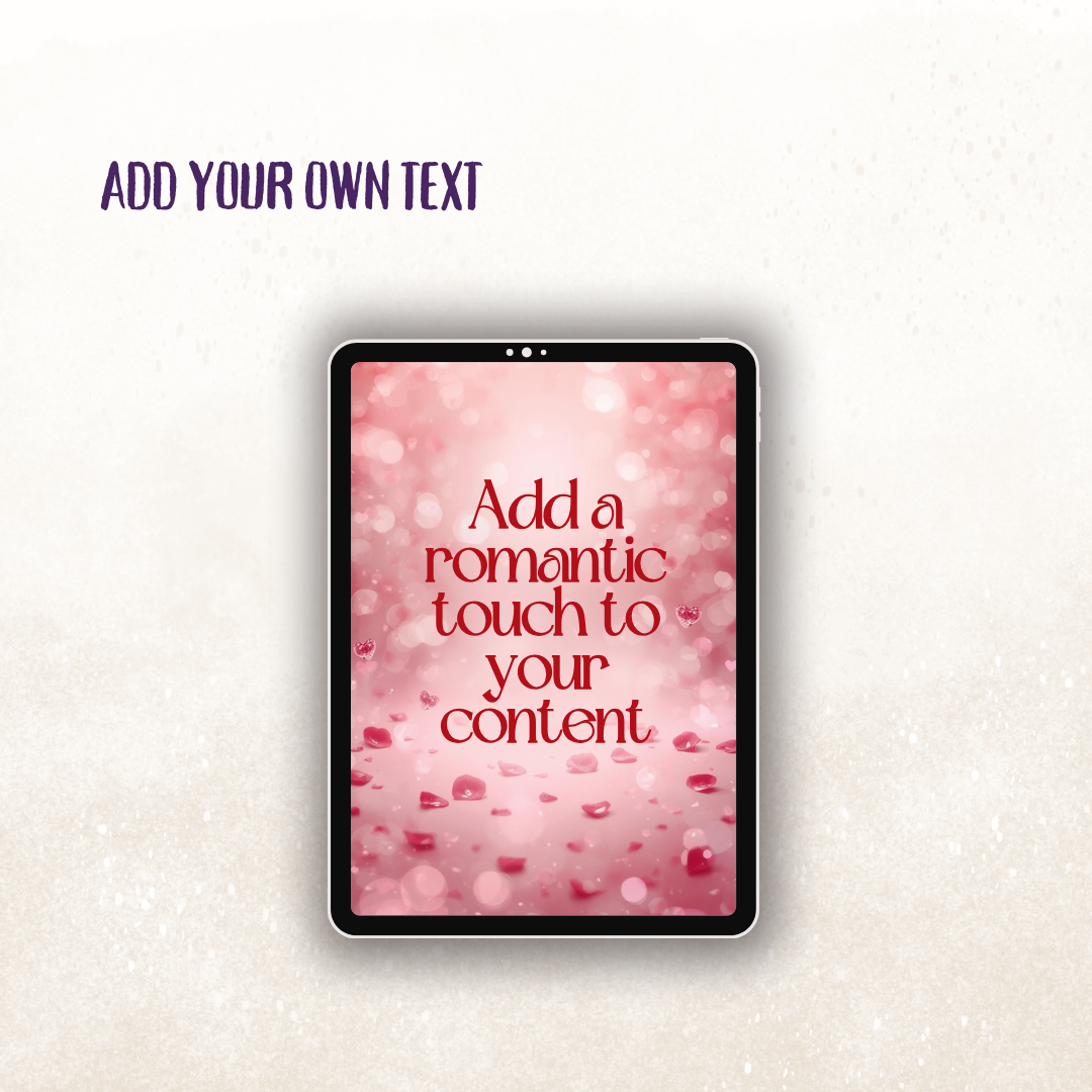 This set features four elegant Valentine-inspired backgrounds with gentle pink tones, subtle bokeh lights and delicate heart details, which work beautifully behind text, quotes, or promotional content.