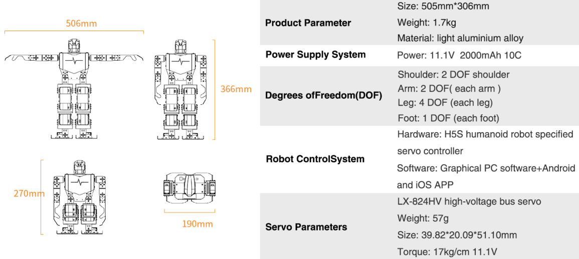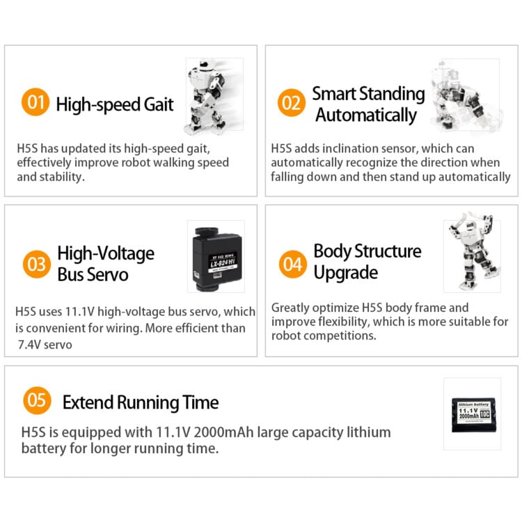 Powerful Control System: Specified H5S servo controller is designed for high performance. It has a built-in tilt sensor, MP3 module, and 16M large memory. It supports free computer drive, TTL serial port communication, offline running, and low voltage alarm to protect the robot.