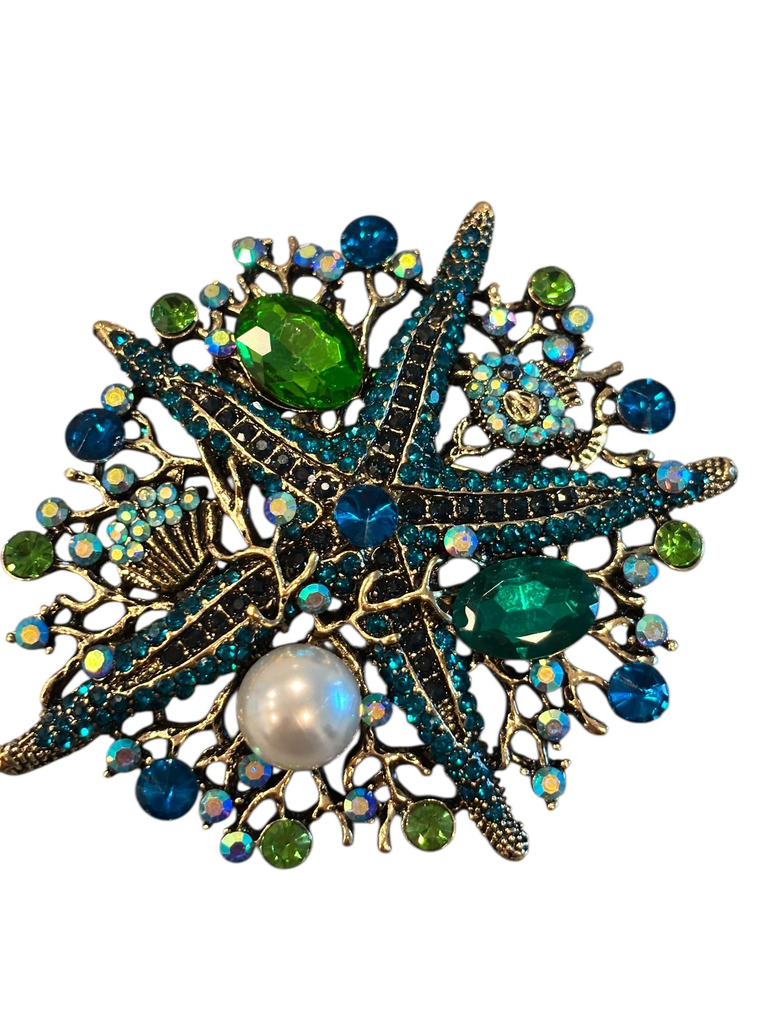 Unique starfish and coral design with blue, green, and pearl accents. Coastal glam with bold sparkle.
