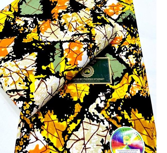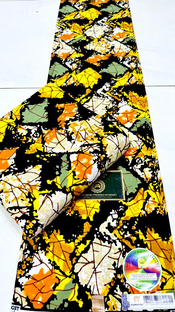 Bring nature’s beauty into your wardrobe with this stunning Phoenix Hitarget Wax Print. Designed with bold shades of yellow, orange, green, black, and white, the pattern features vibrant leaf motifs that evoke the warmth and richness of autumn. Perfect for stylish clothing, accessories, or décor, this fabric combines creativity with durability.