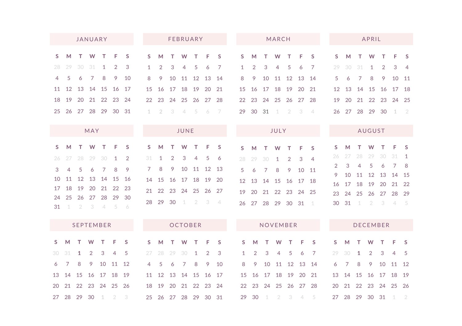 Each month includes: